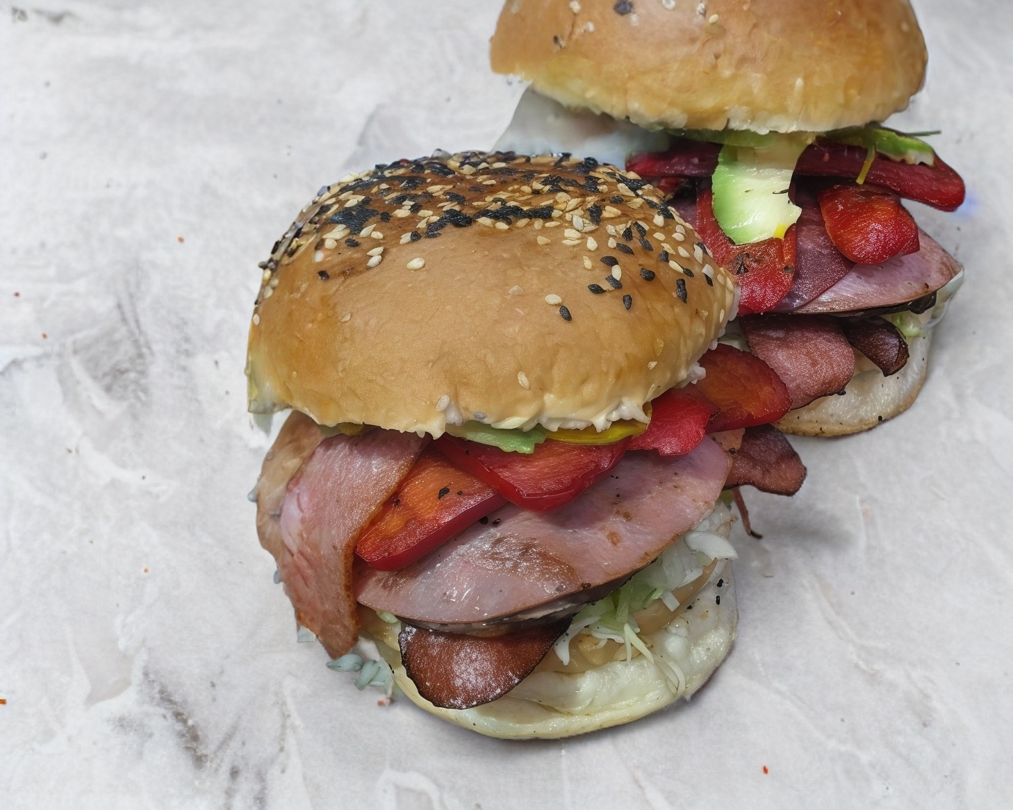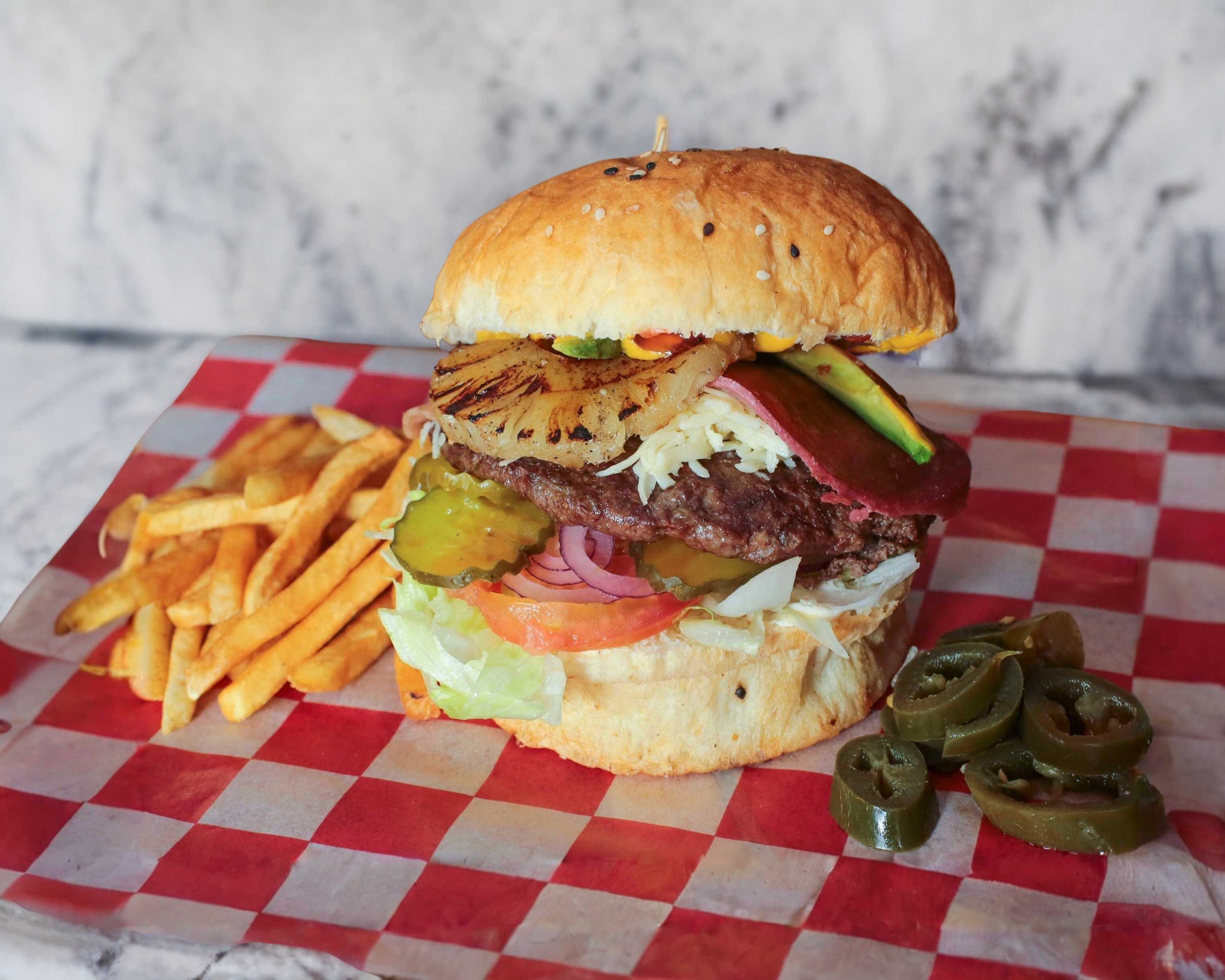 Doble carne, salsa BBQ, tocino dorado, piña asada, jamón , queso y salami.