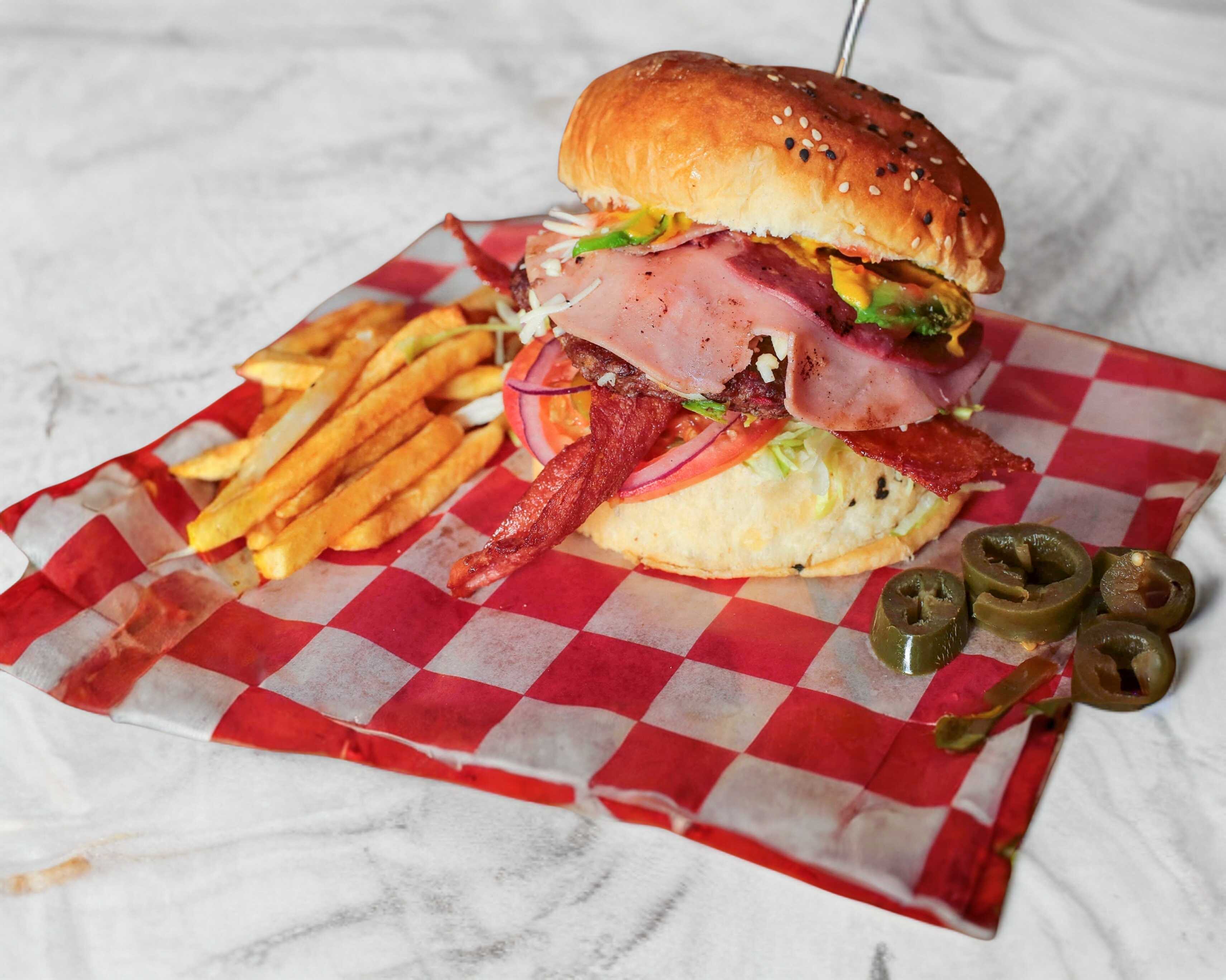 Jamón, queso, salami, aderezada con salsa BBQ, ingredientes: lechuga, jitomate, cebolla, pepinillos, salsa cátsup, mayonesa, mostaza y papas a la francesa.