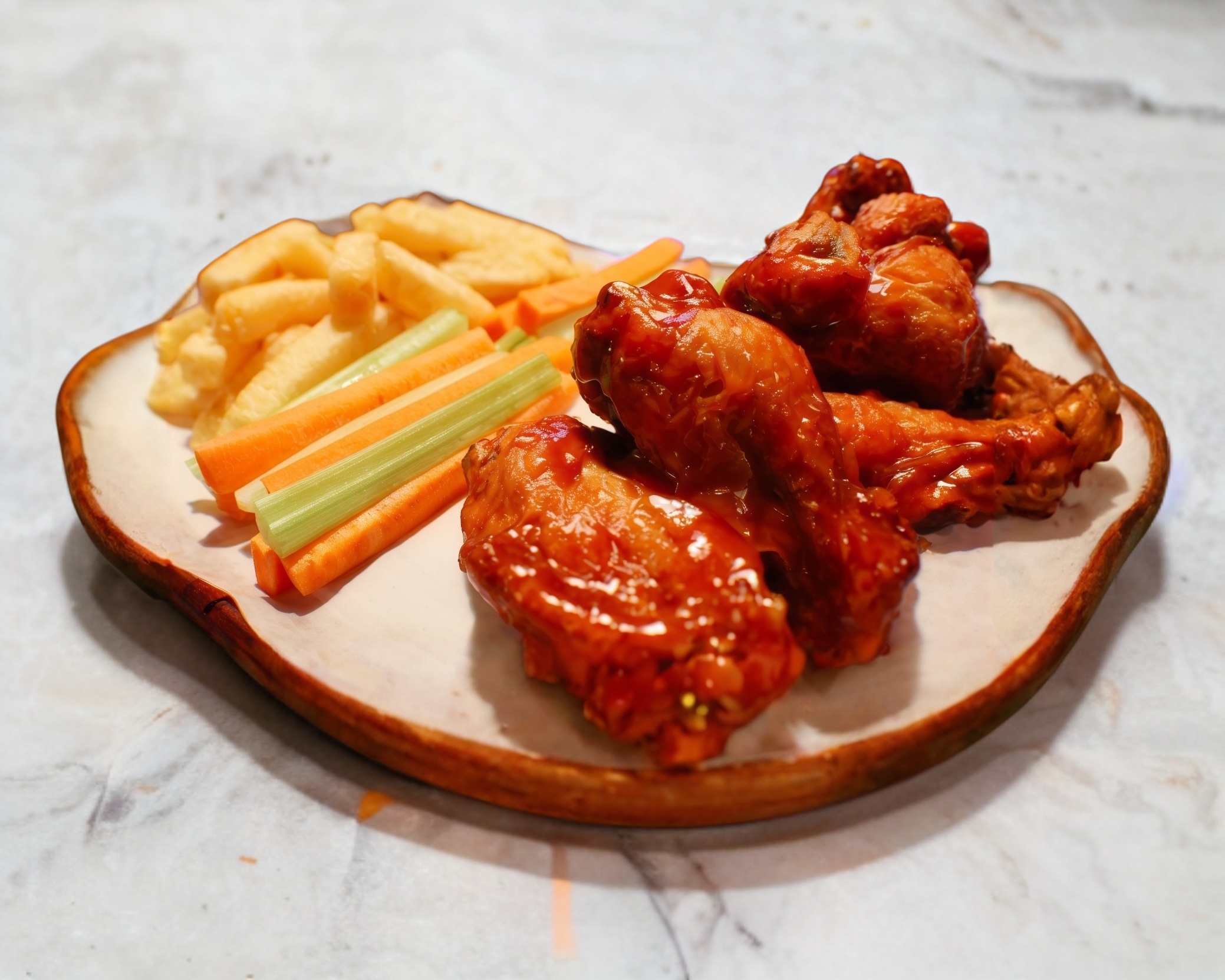 250 g de alitas(peso en crudo), palitos zanahoria y 70 g de papas a la francesa( peso en crudo).