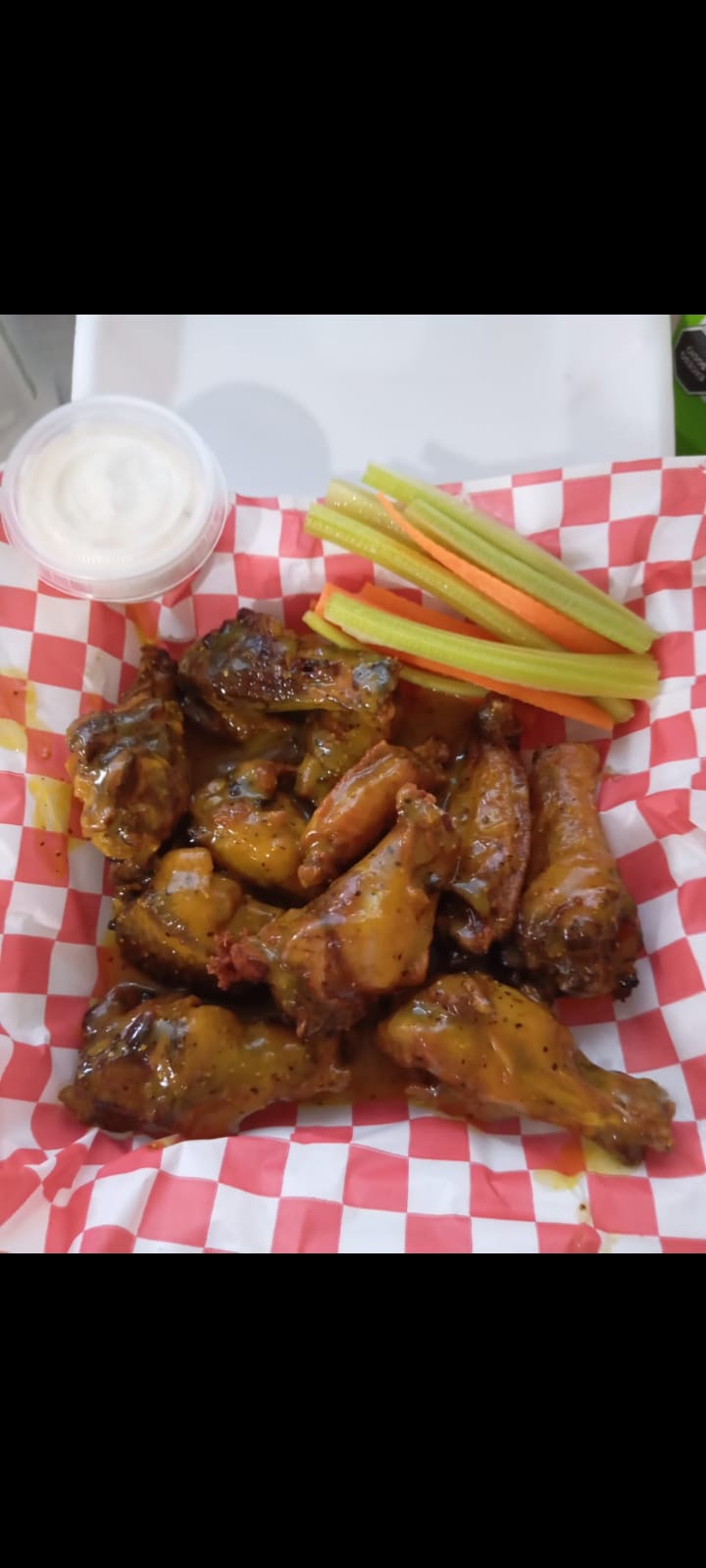 500 grms de alitas bañadas en tu salsa favorita con apio, zanahoria y aderezo ranch