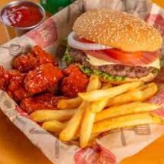 hamburguesa clasica, 5 pzas de boneles bañados a tu gusto, y porcion de papas fritas con queso amarillo