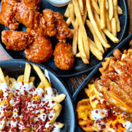 papas fritas con porcion de boneless de pollo crujiente encima ,bañados en queso amarillo aderezo ranch y tu salsa favorita