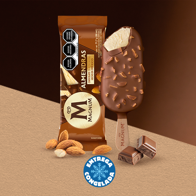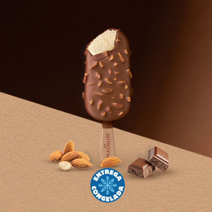Disfruta de un placer crujiente con esta paleta de cremoso helado de vainilla cubierta de trozos de almendra y chocolate. Dos paletas Magnum Almendra 90ml.
