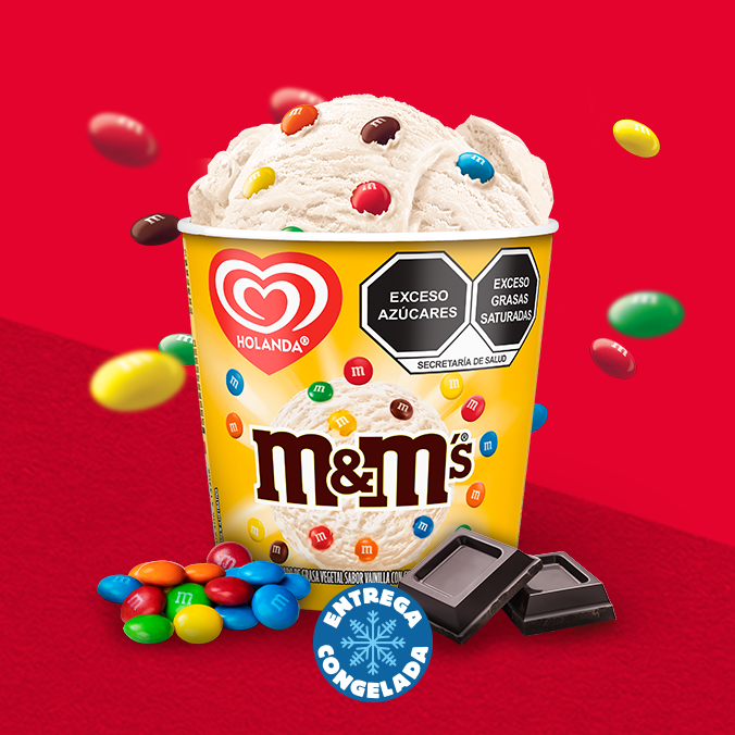 Deléitate con 473ml de helado Holanda sabor vainilla con M&Ms®. Una explosión de sabor y color en cada cucharada.