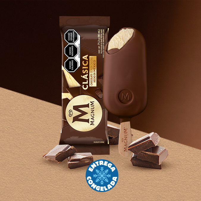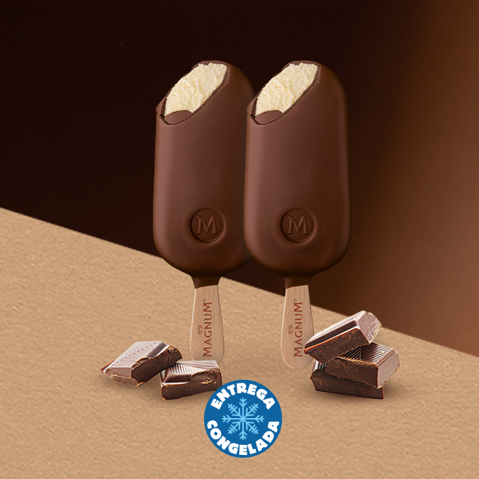 El perfecto equilibrio del crujiente chocolate Magnum de cacao de alta calidad, suave y cremoso helado de vainilla. Dos paletas Magnum Clásica de 90 ml.
