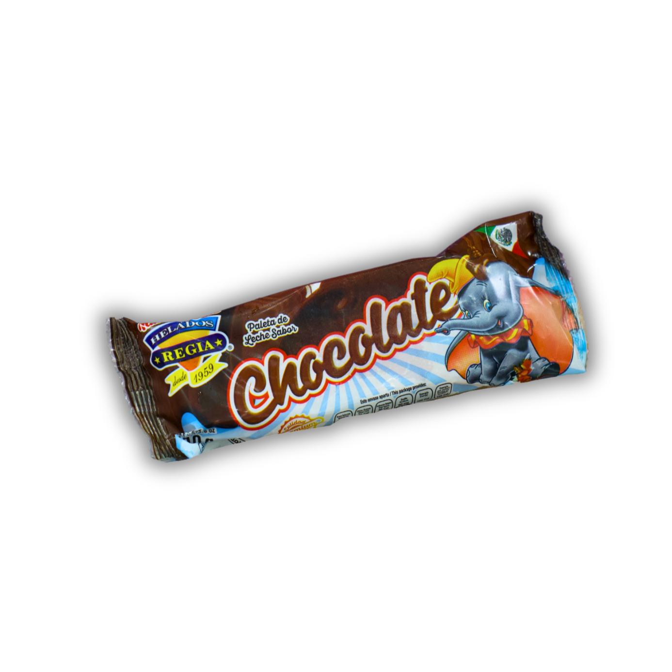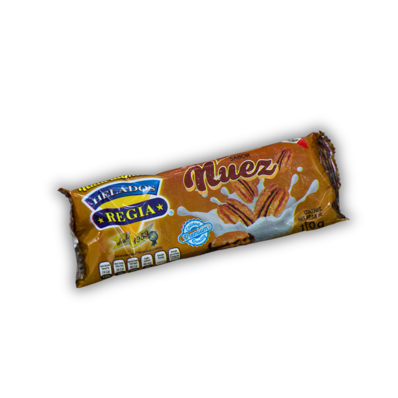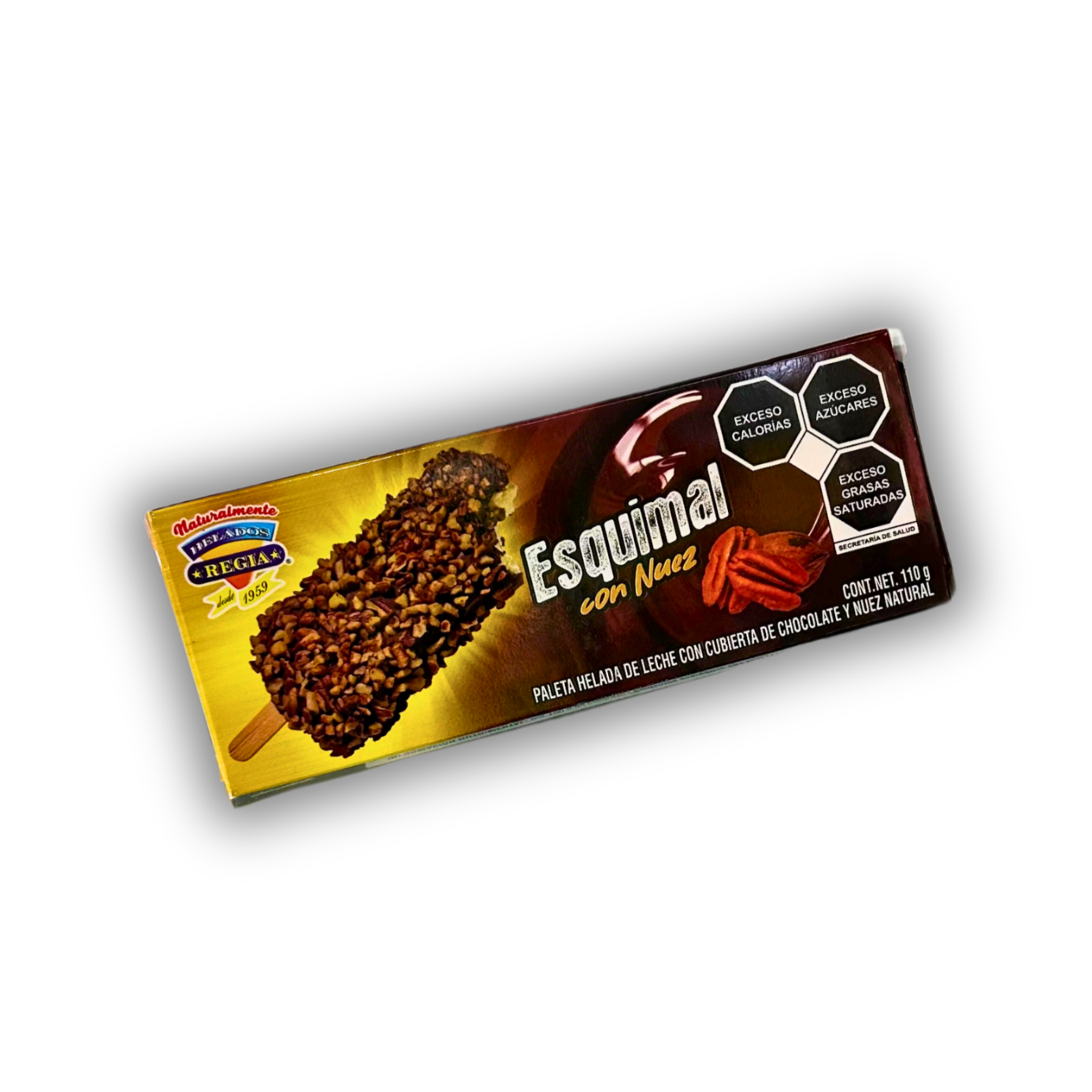 Paleta elaborada a base de crema sabor vainilla cubierta de chocolate con nuez.