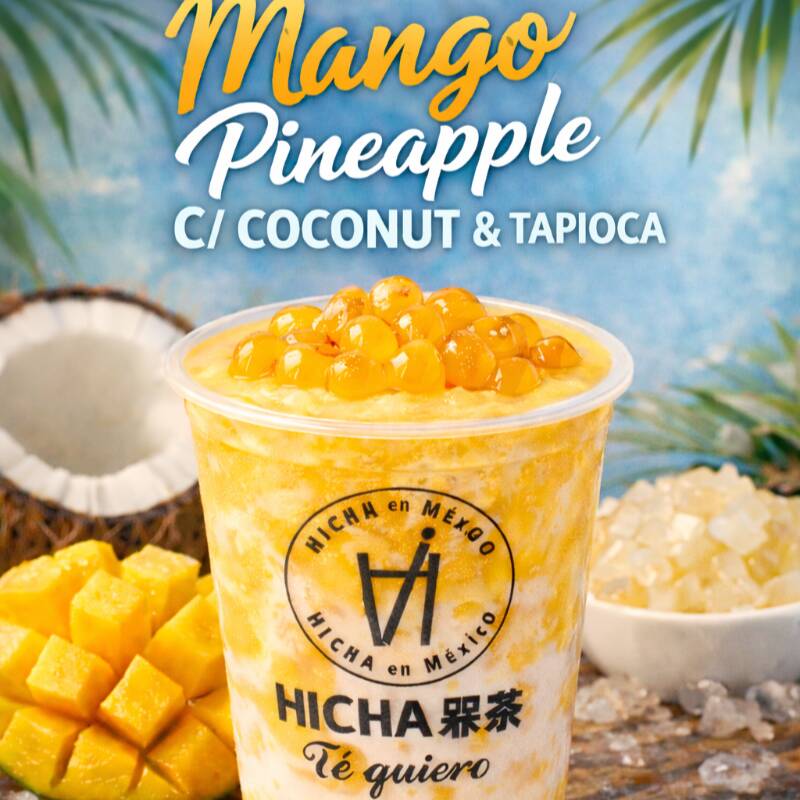Bebida de mango con pulpa de mango, té de jazmín y Yakult, fresca y equilibrada, con boba opcional.