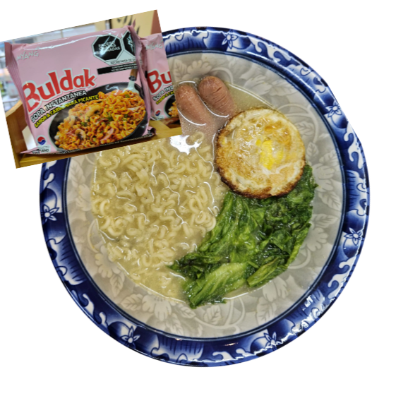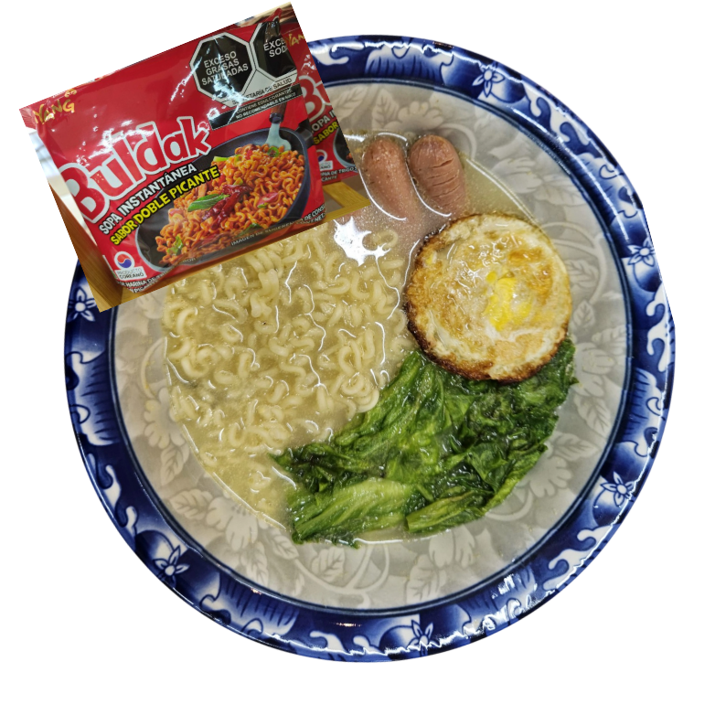 Ramen doble picante con salchicha de pavo, huevo, verdura. Sobre de picante aparte. Ramen y caldo separado para evitar que se apalmacen