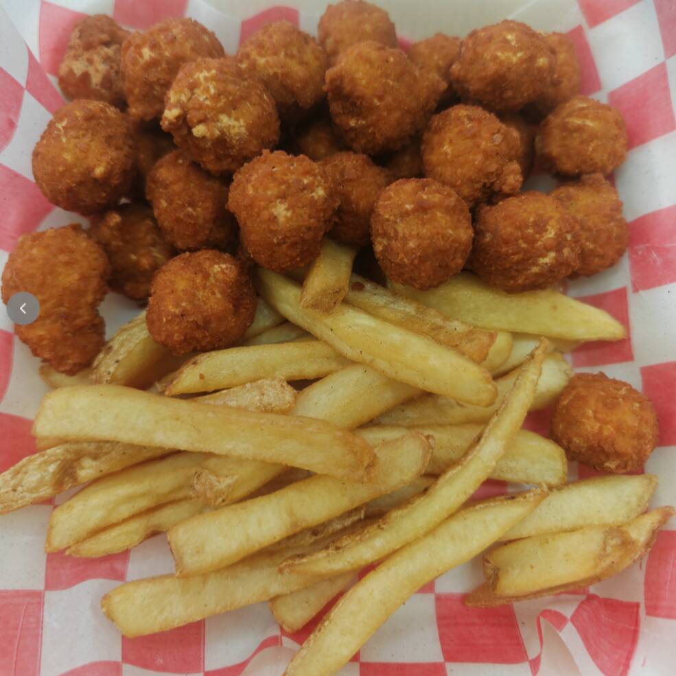 palomitas de pollo con papas y bebida para elegir. Con salsa ketchu y mayonesa incluido