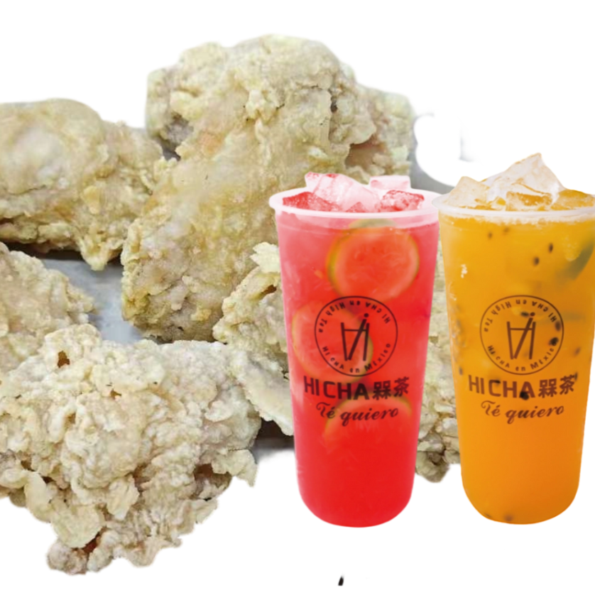 Alitas de pollo frito 500g y papas fritas 200g. Y 2 Te de sabores para elegir