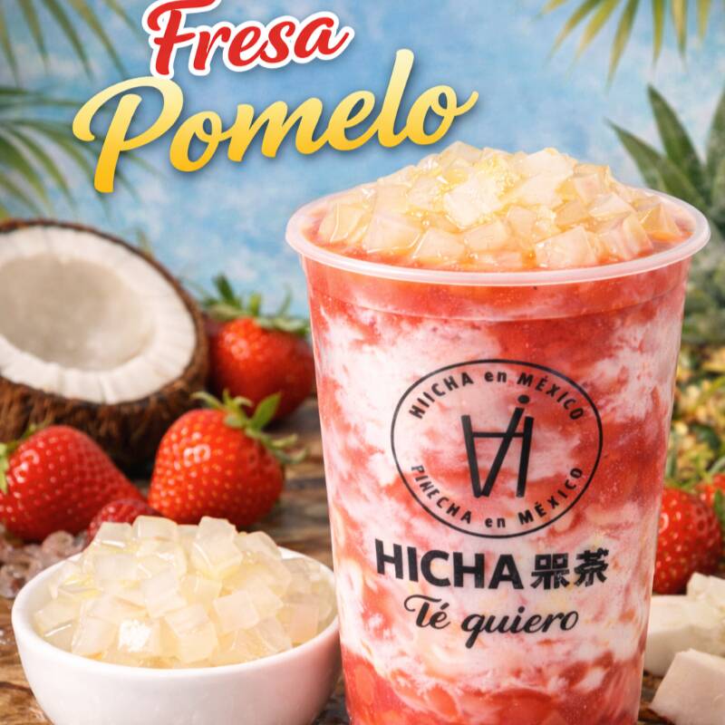 Frappé refrescante de fresa y pomelo, acompañado de boba, con sabor equilibrado entre dulce y cítrico