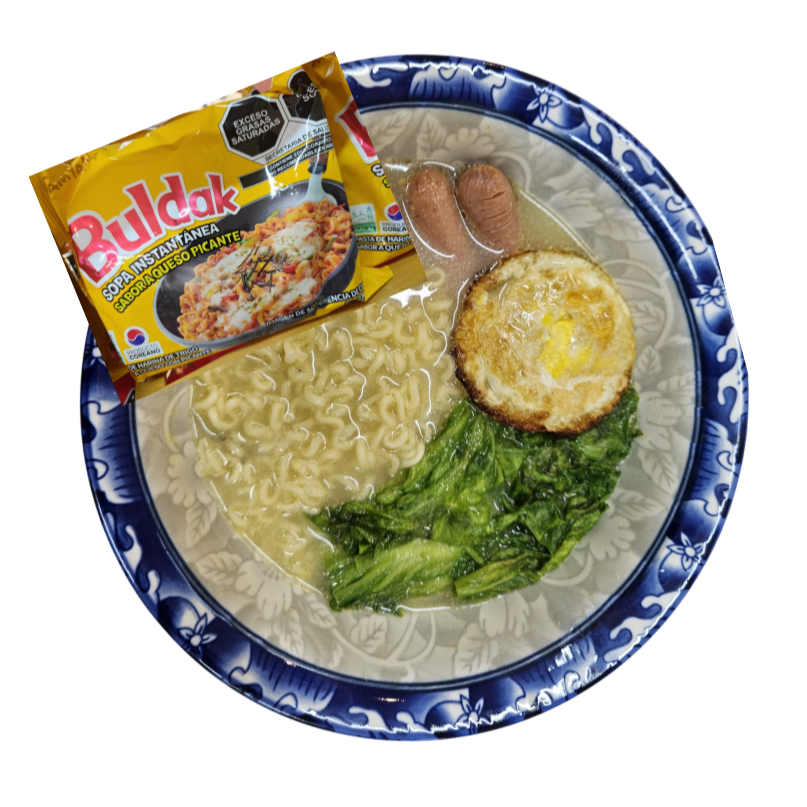 Ramen Queso con salchicha de pavo, huevo, verdura. Sobre de picante aparte. Ramen y caldo separado para evitar que se apalmacen