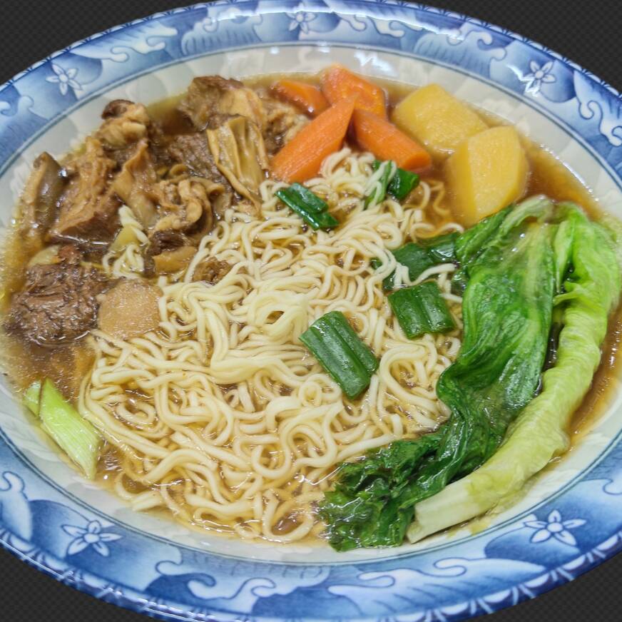 Ramen con carne de res, patatas, zanahoria, verdura y poco de hongos
