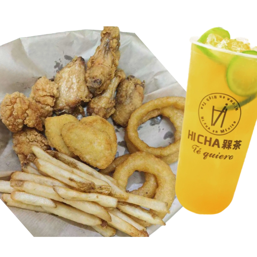 Combinacion de 600g de alitas de pollo + 400g de papas fritas Y 1L de Milk Tea con tapiocas