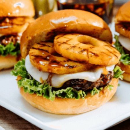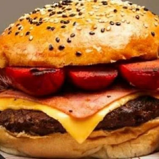 Una hamburguesa de carne con salchicha asada, ,queso , verduras y aderezos de la casal