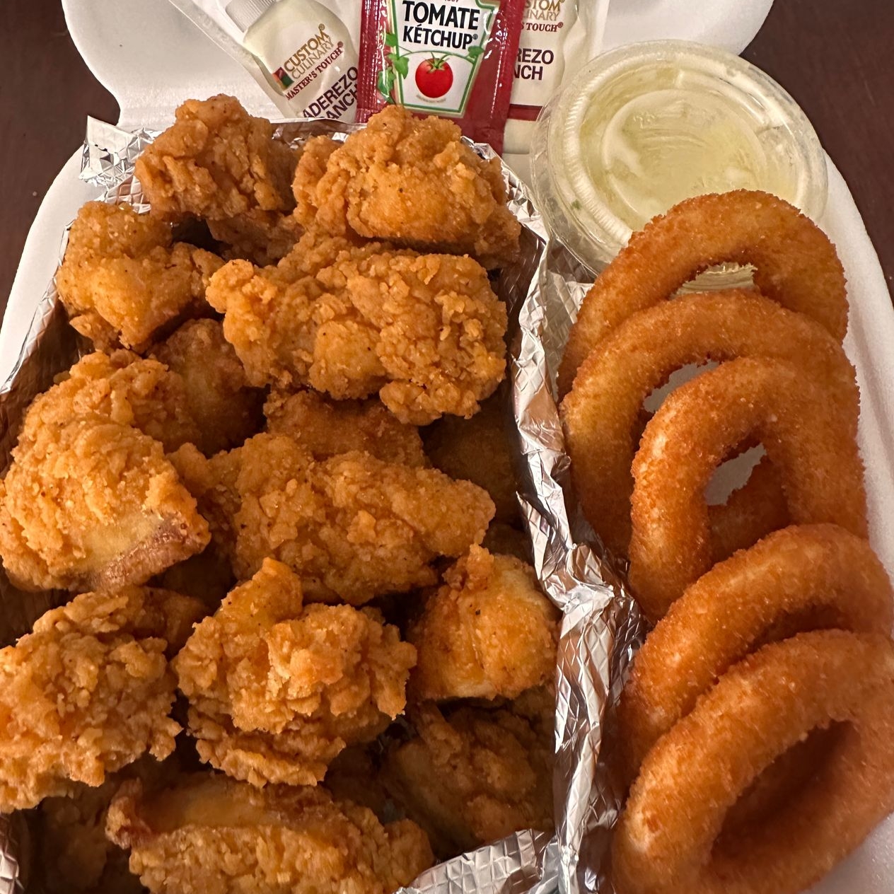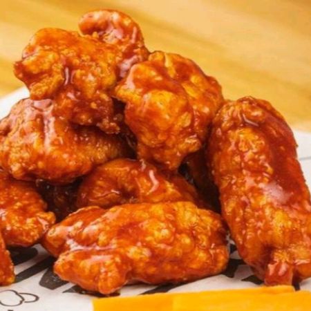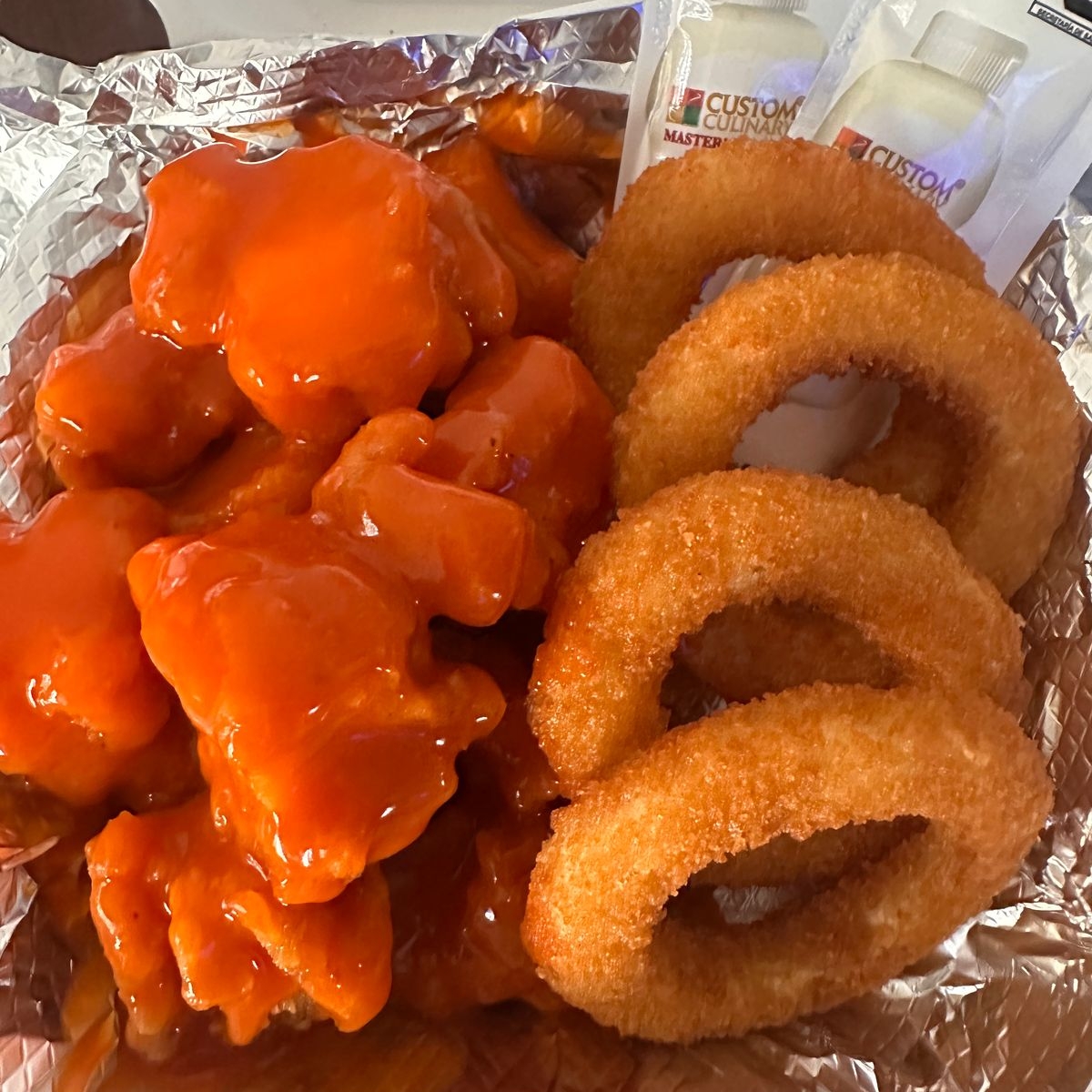 Medio boneles bañados en tu salsa favorita acompañado de aros de cebolla crujientes