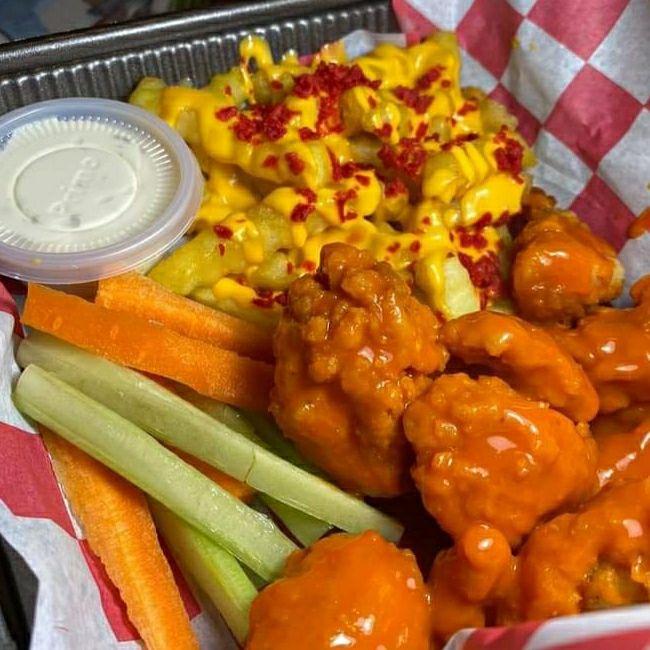 6 Piezas de boneless, bañados en tu salsa favorita, acompañado de papas a la francesa, aderezo ranch y verduras.