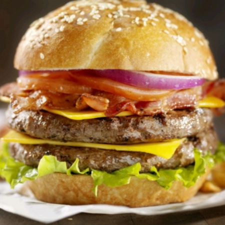 Doble hamburguesa de carne, queso americano, lechuga, tomate y cebolla.