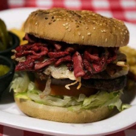 Una hamburguesa de carne con salchicha asada, ,queso , verduras y aderezos de la casal