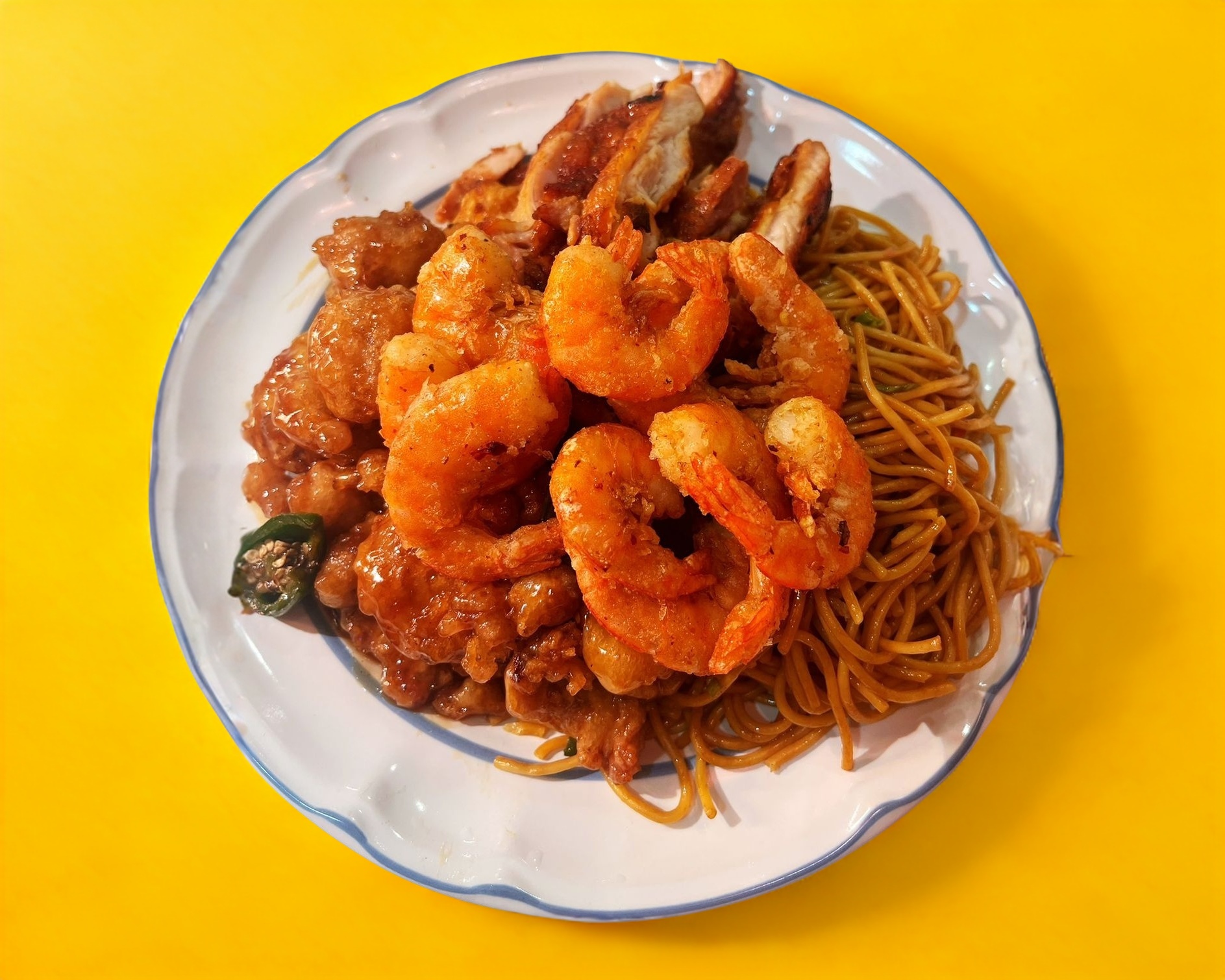 2 guisos +Camaron, arroz o pasta o mitad arroz mitad pasta.