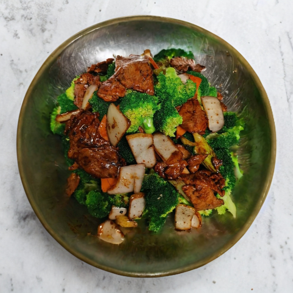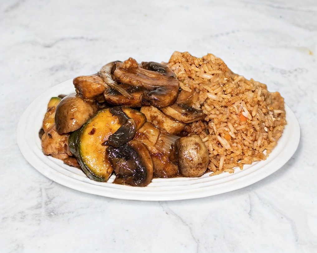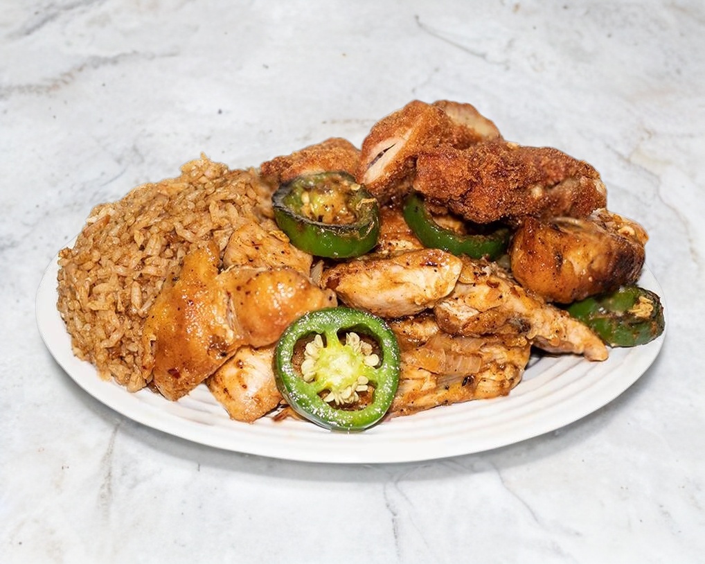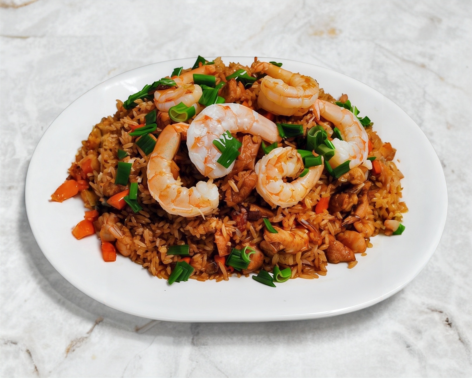 Arroz frito acompañado con camarón, carne, pollo y verduras.
