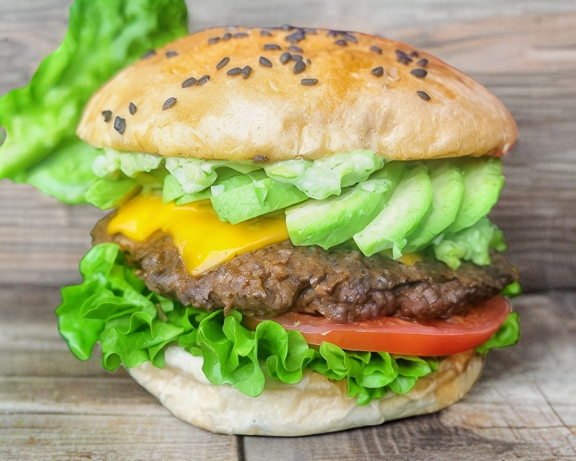 Pan, Aderezo de la Casa, Lechuga, Tómate, Carne, Queso Americano y Crema de Aguacate.