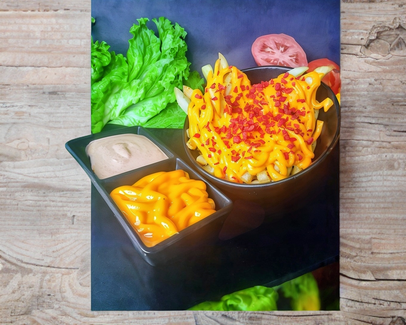 Porción de Papas a la Francesa en Plato Chico, Bañadas en Queso Amarillo y Tocino Seco.