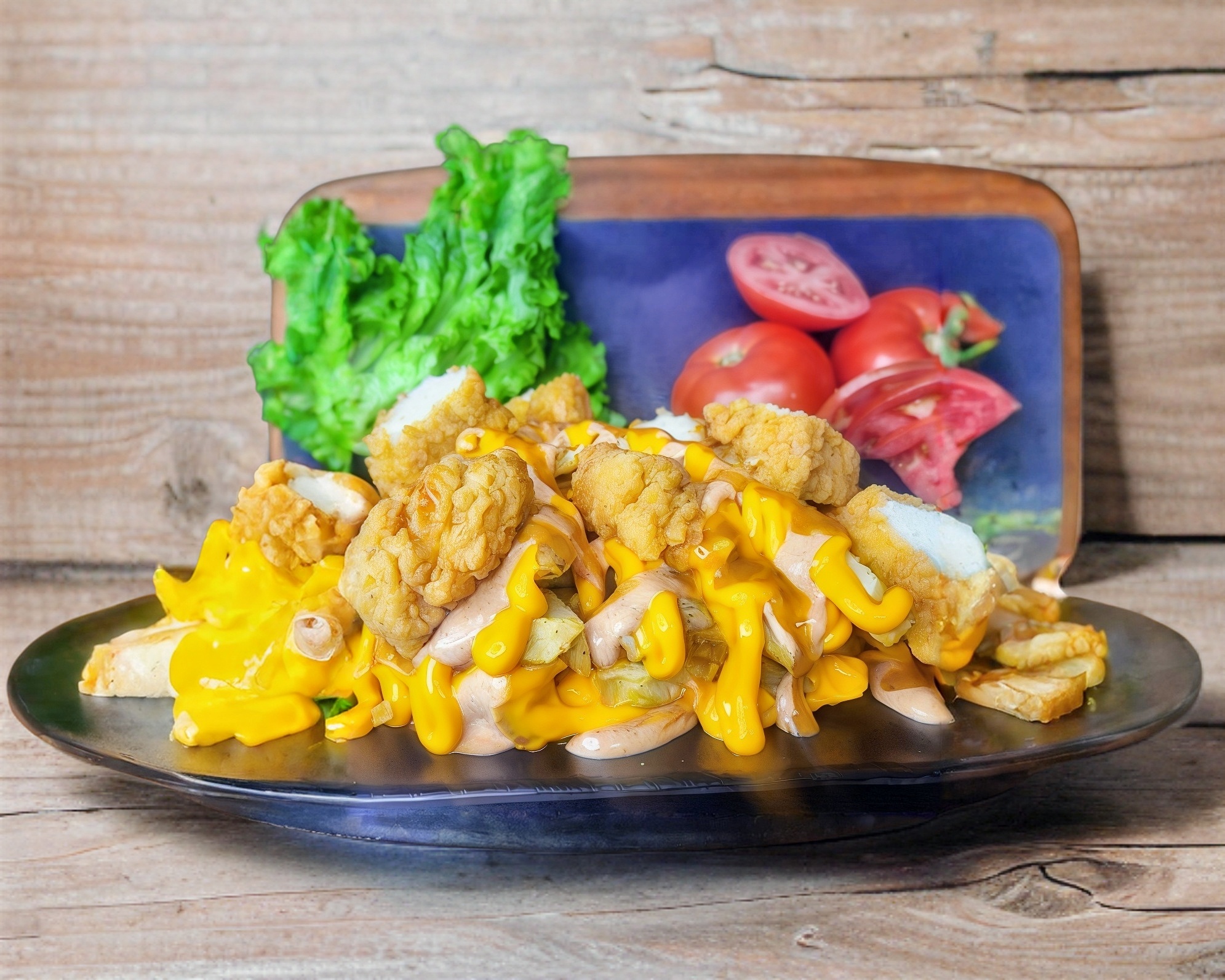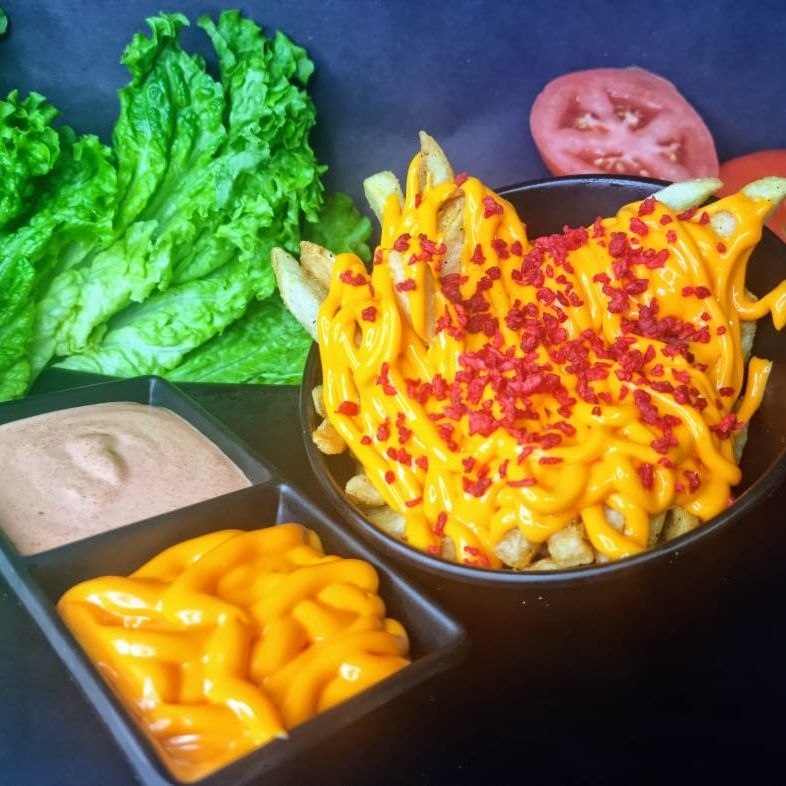 Plato Grande de Papas a la Francesa, Trozos de Boneless, Queso Amarillo, Aderezo de la Casa y Salsa a Elegir.