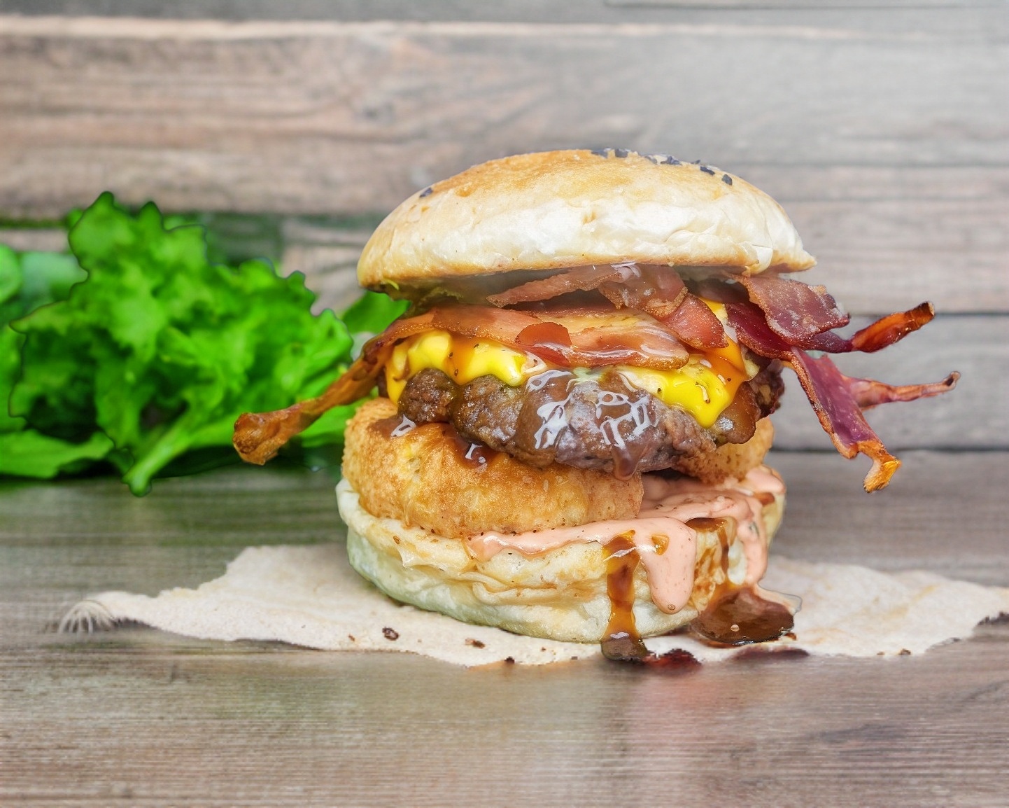 Pan, Aderezo de la Casa, Aros de Cebolla, Carne, Queso Americano, Tocino y BBQ.