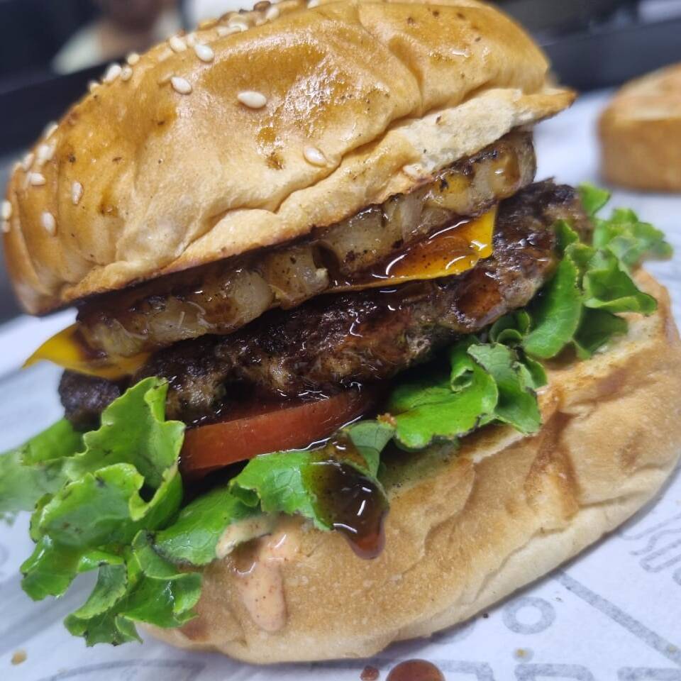 Pan Artesanal, Aderezo Casero, Aros de Cebolla, Jugosa Carne Casera, Queso Americano, Tocino y BBQ.
