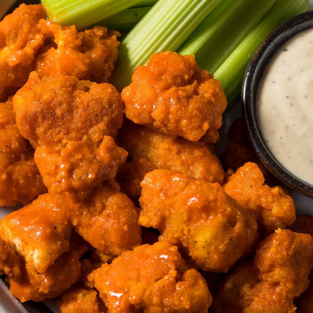 11 Boneless recién hechos, bañados al gusto, aderezo ranch.