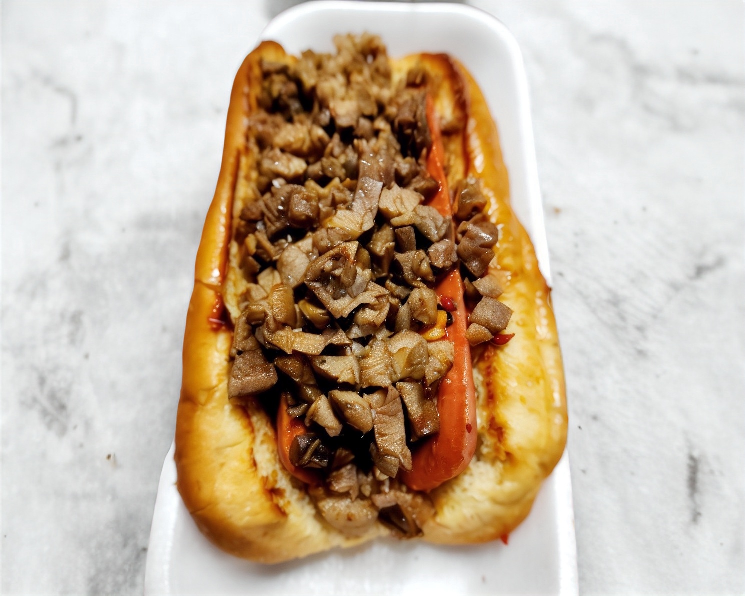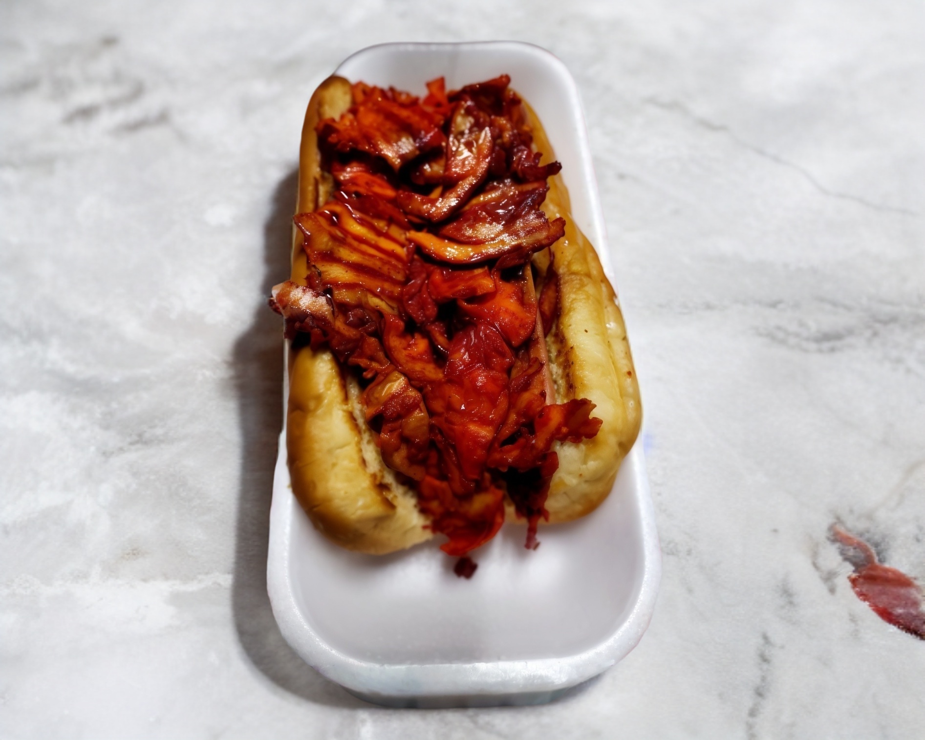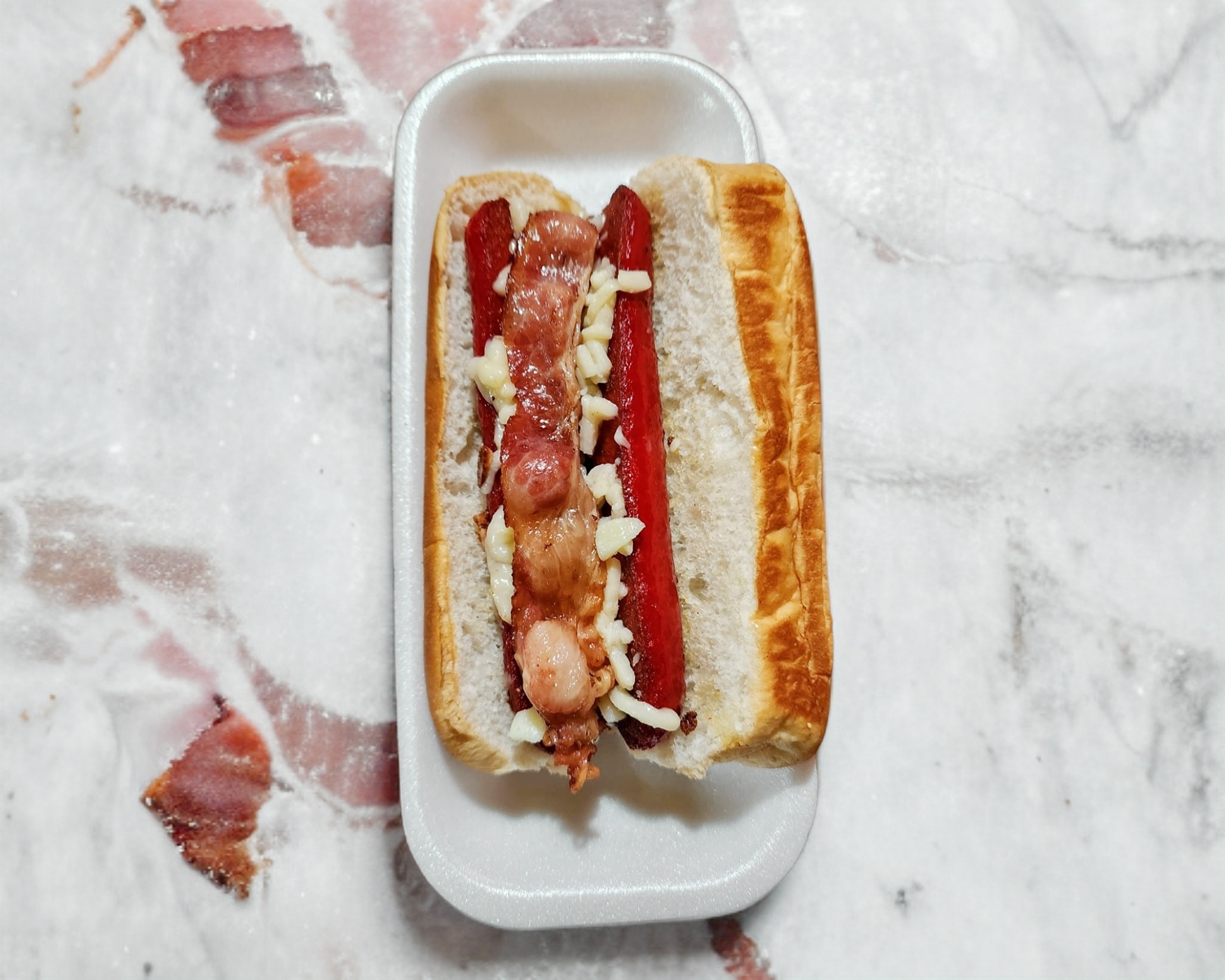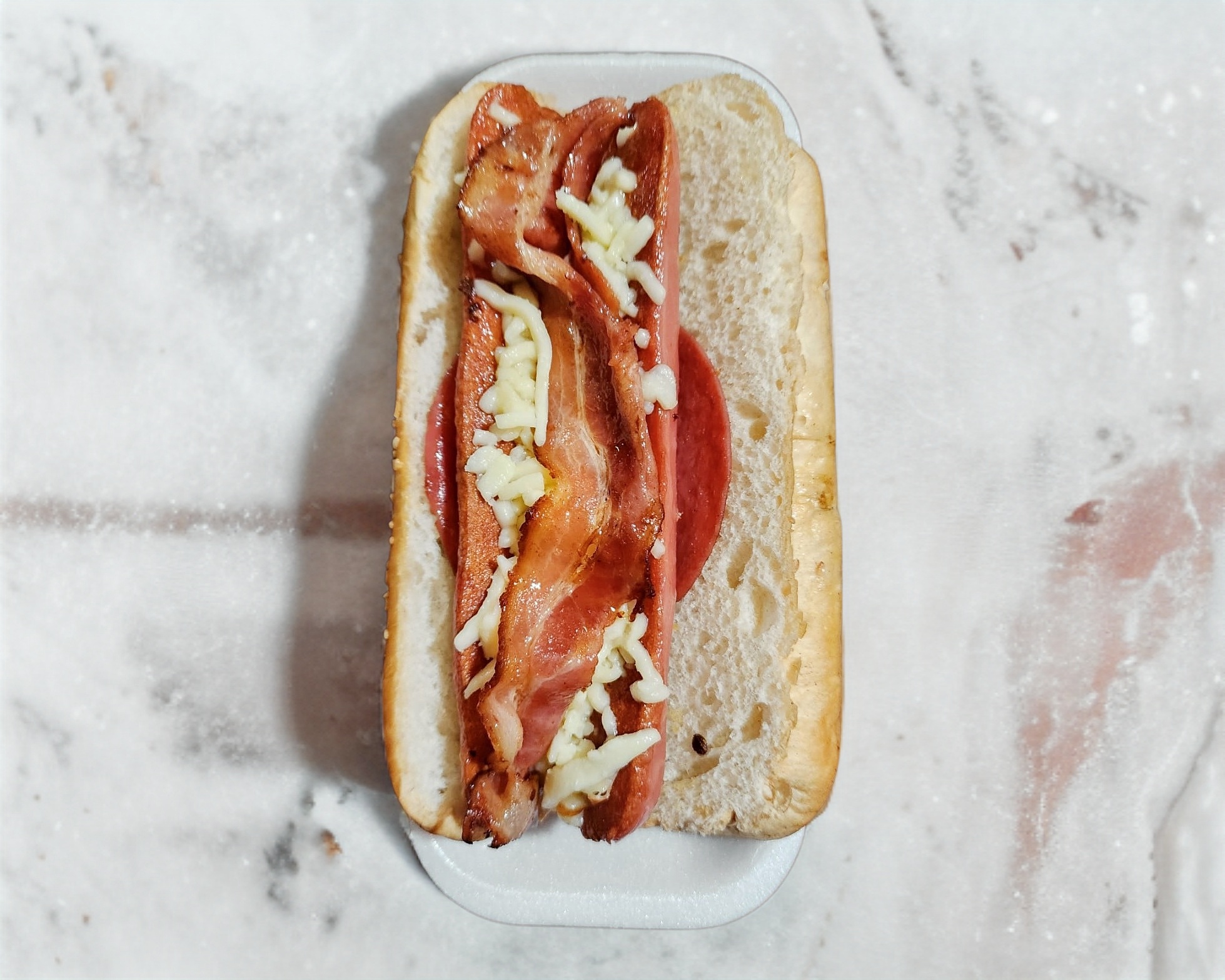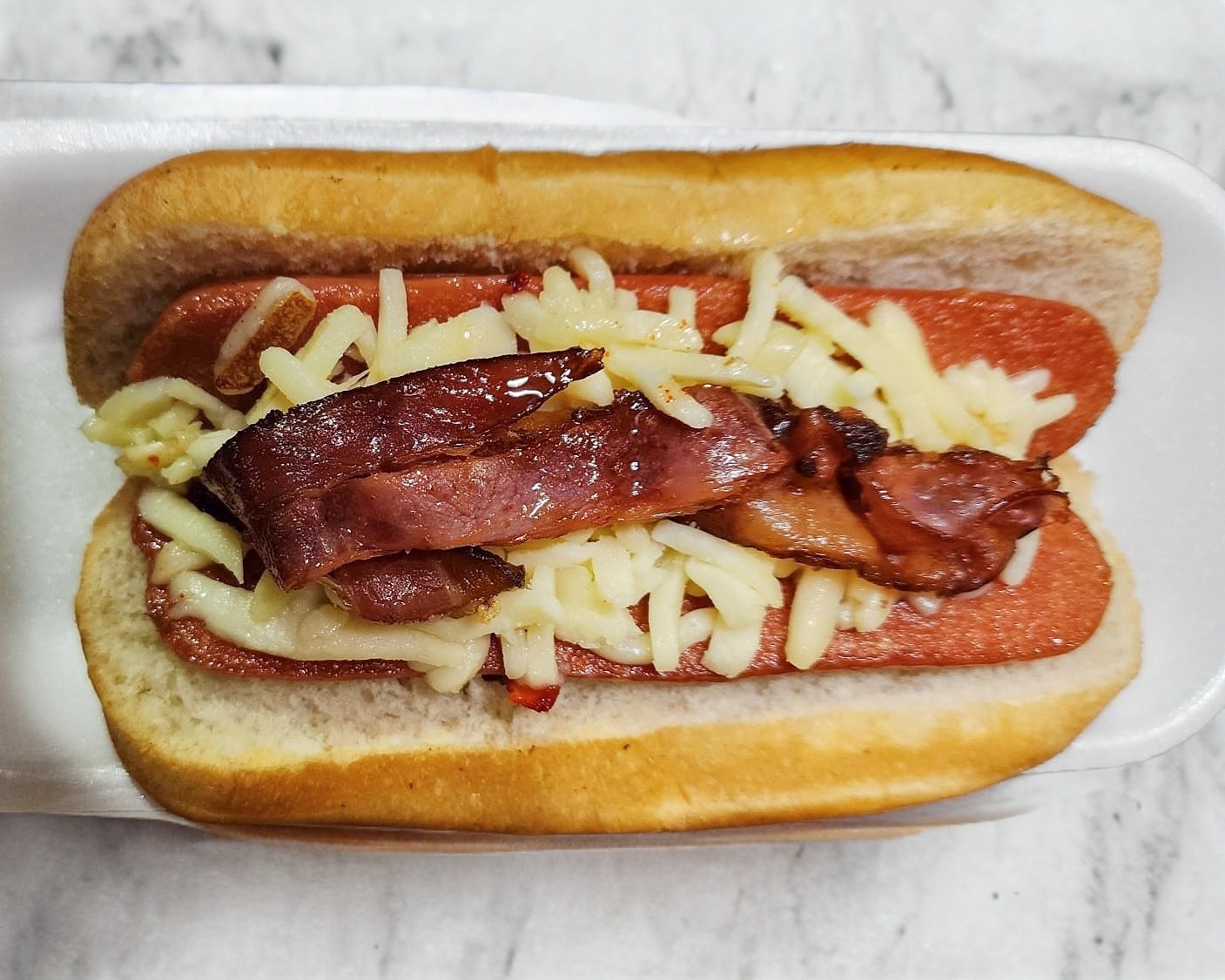 Salchicha roja aza, servida con pan del día con queso y tocino. No lleva carne de trompo