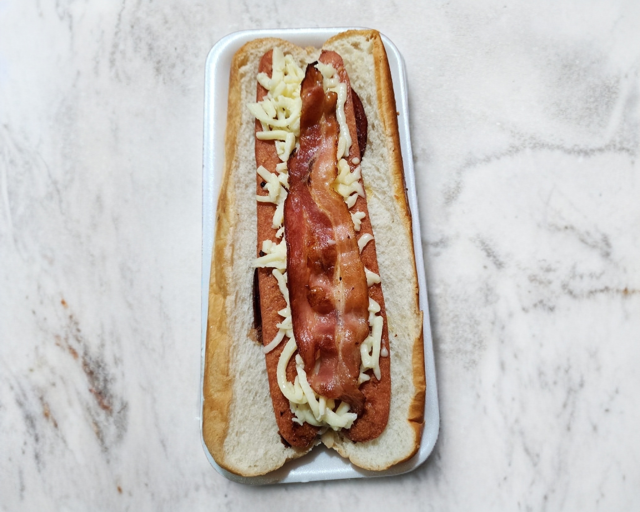 Nuestra clasica salchicha de pavo con pan del día con queso y tocino