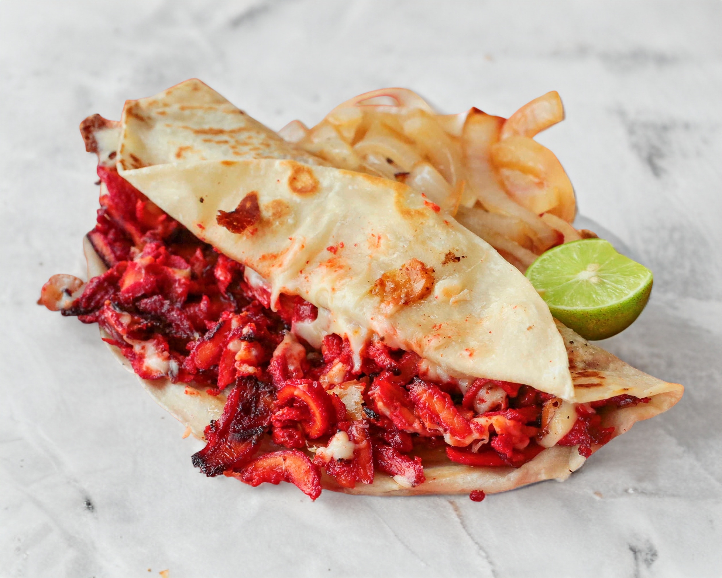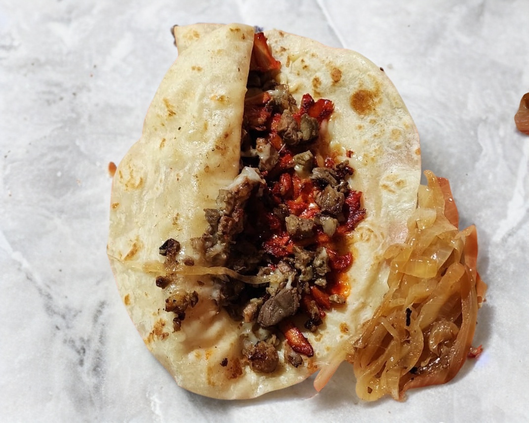 Tortilla de harina grande, servida con trompo bien doradito y queso acompañada de cebollitas asadas y salsa verde y roja.
