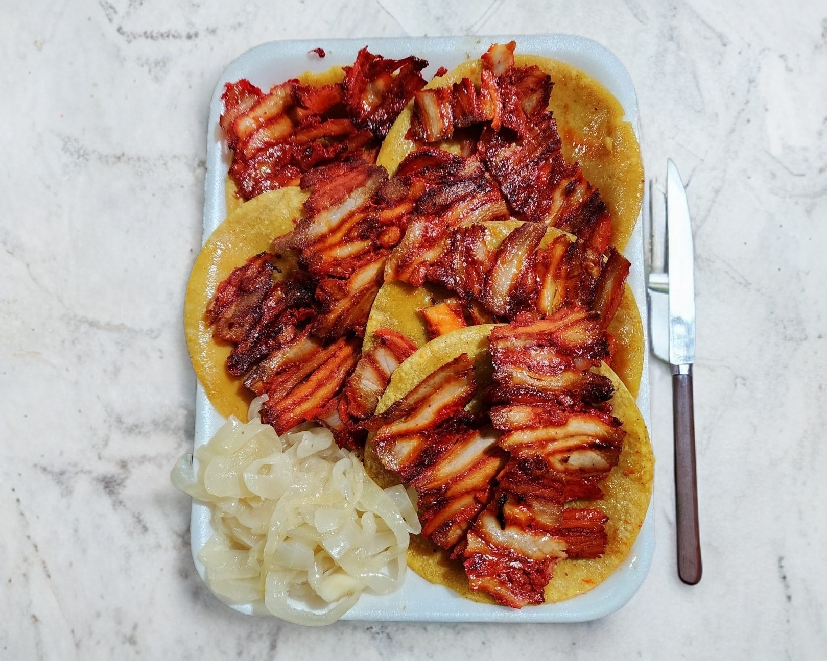 5 tacos de trompo bien doraditos, cebollita asada y sus salsas.