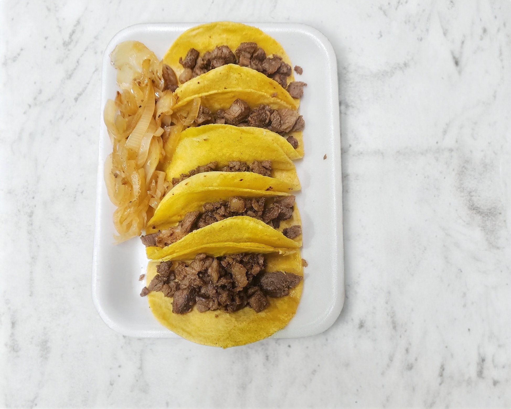 5 tacos de carne asada Sirloin. Servidos con cebollita asada, salsas verde y salsa roja ( incluyen ambas salsas)