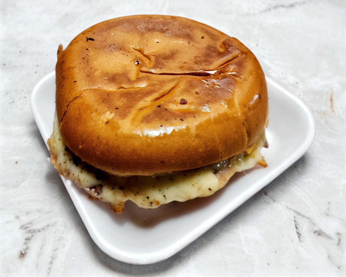 Servida con salchicha de pavo, pan dorado con mayonesa por dentro, queso y trompo.
