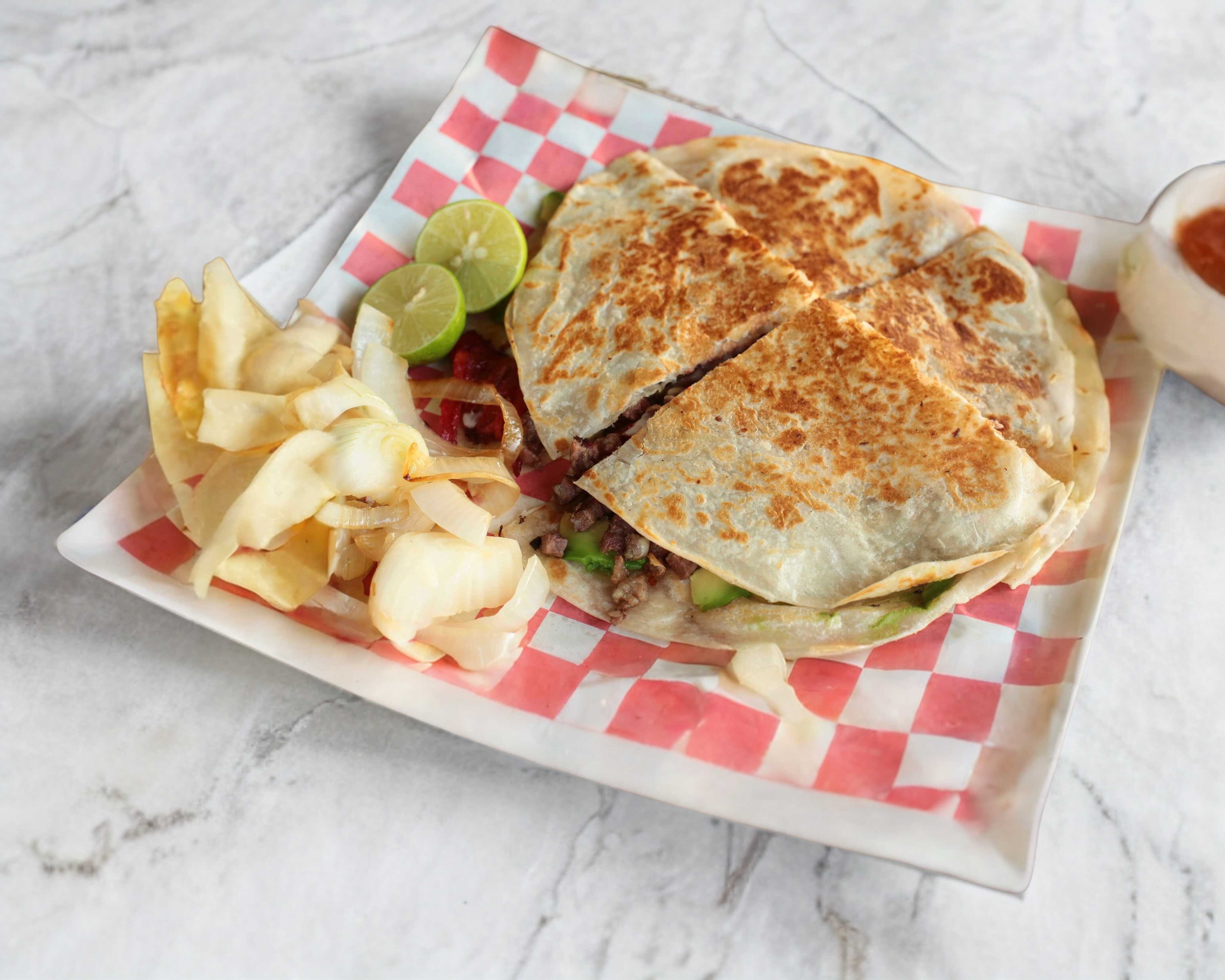 Tortilla de harina grande, carne asada, queso servida con cebollita asada y salsas.