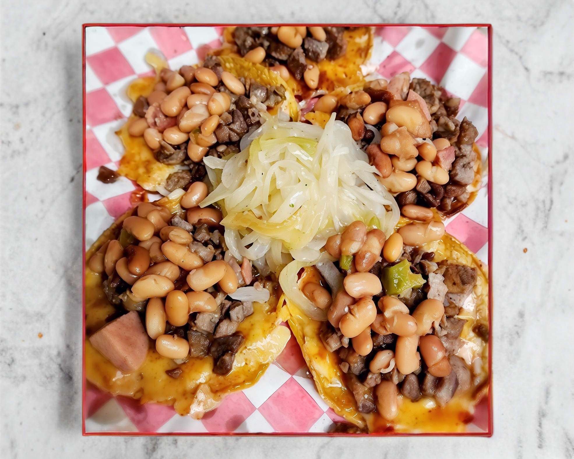 5 tostaditas, de carne asada cubiertas con frijoles charros y queso fundido con su cebollita asada y salsas.