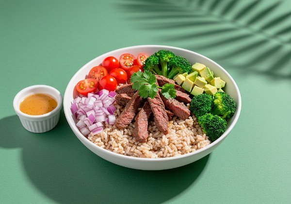 Bowl a base de arroz integral con arrachera, brócoli, tomate cherry, cebolla morada, aguacate, cilantro y vinagreta a elección. El tamaño perfecto para que lo acompañes con tu sopa o wrap favorito.