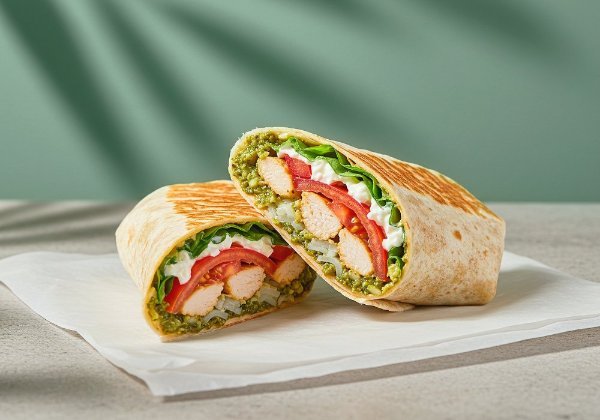 Wrap en tortilla de harina relleno con pollo pesto, queso mozzarella, jitomate, lechuga, crema y pesto.