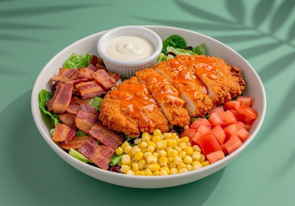 Ensalada a base de lechuga con pollo empanizado en salsa Buffalo, tocino, maíz dulce, jitomate y aderezo a elección. El tamaño perfecto para que la acompañes con una sopa o wrap.