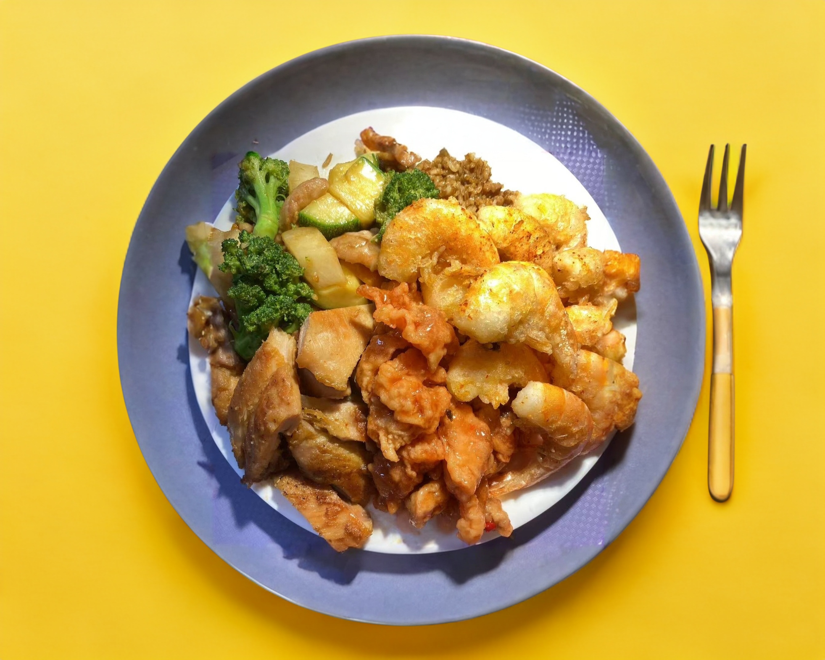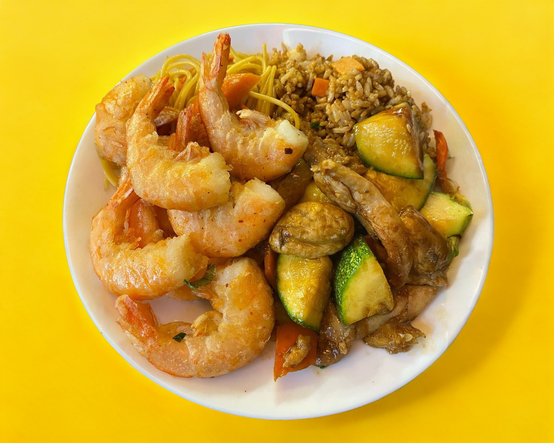 Camarones + pollo con vegetales + Arroz y pastas