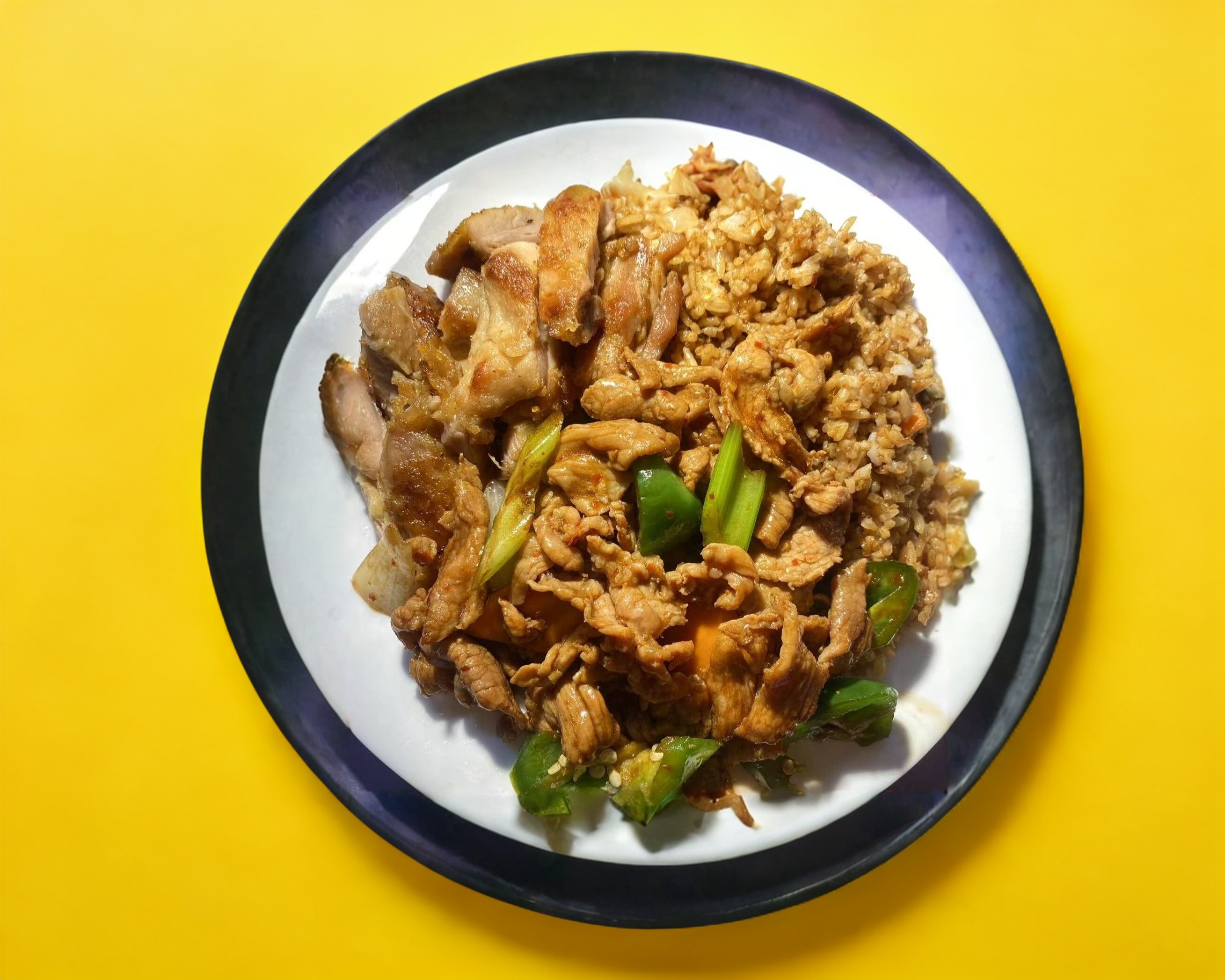 Carné picante + pollo con vegetales + Arroz y pasta