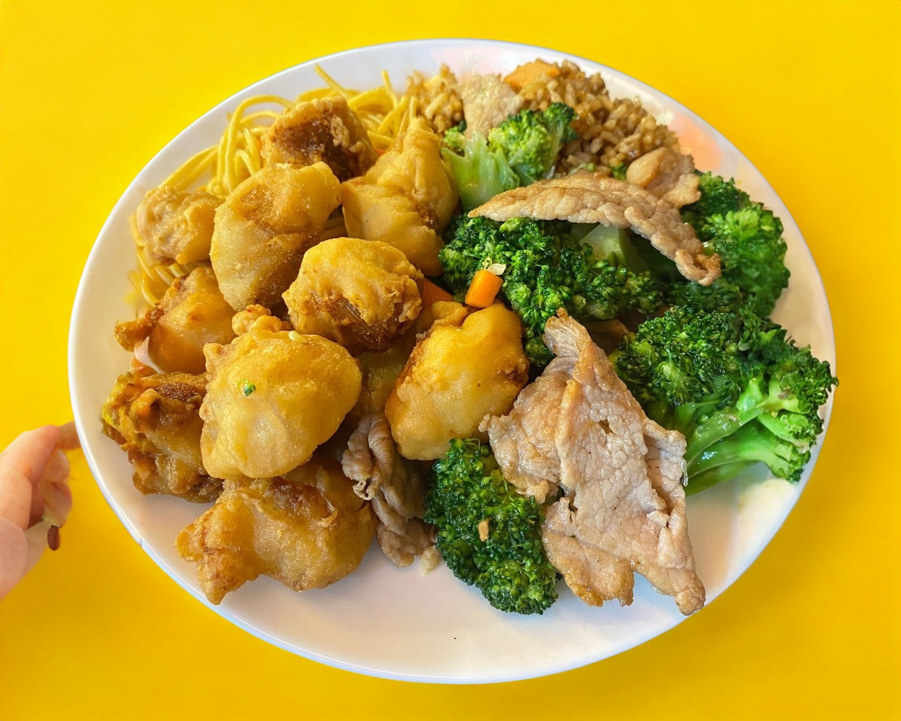 Pollo agridulce picante + carné con brócoli + arroz y pasta