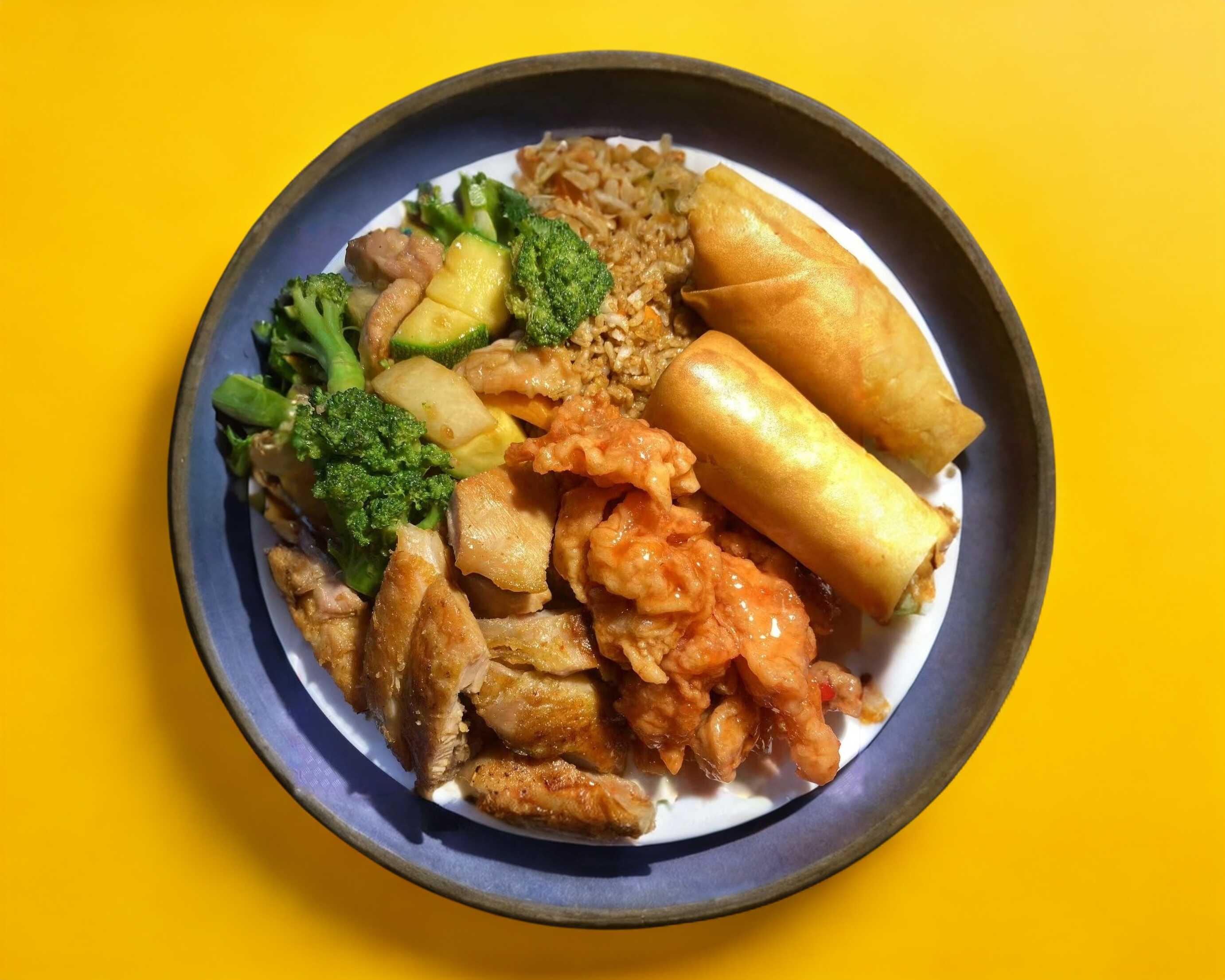 Dos Guisos Con Arroz Mixto O Pasta Mixta, Pollo Agridulce, Pollo Empanizado, Pollo Picante, Brócoli Con Res, Pollo Agridulce Picoso, Carne De Res Picante, Pollo Cantonés, Pollo Con Vegetales, 2 Rollos, Pollo A La Plancha O Pollo BBQ