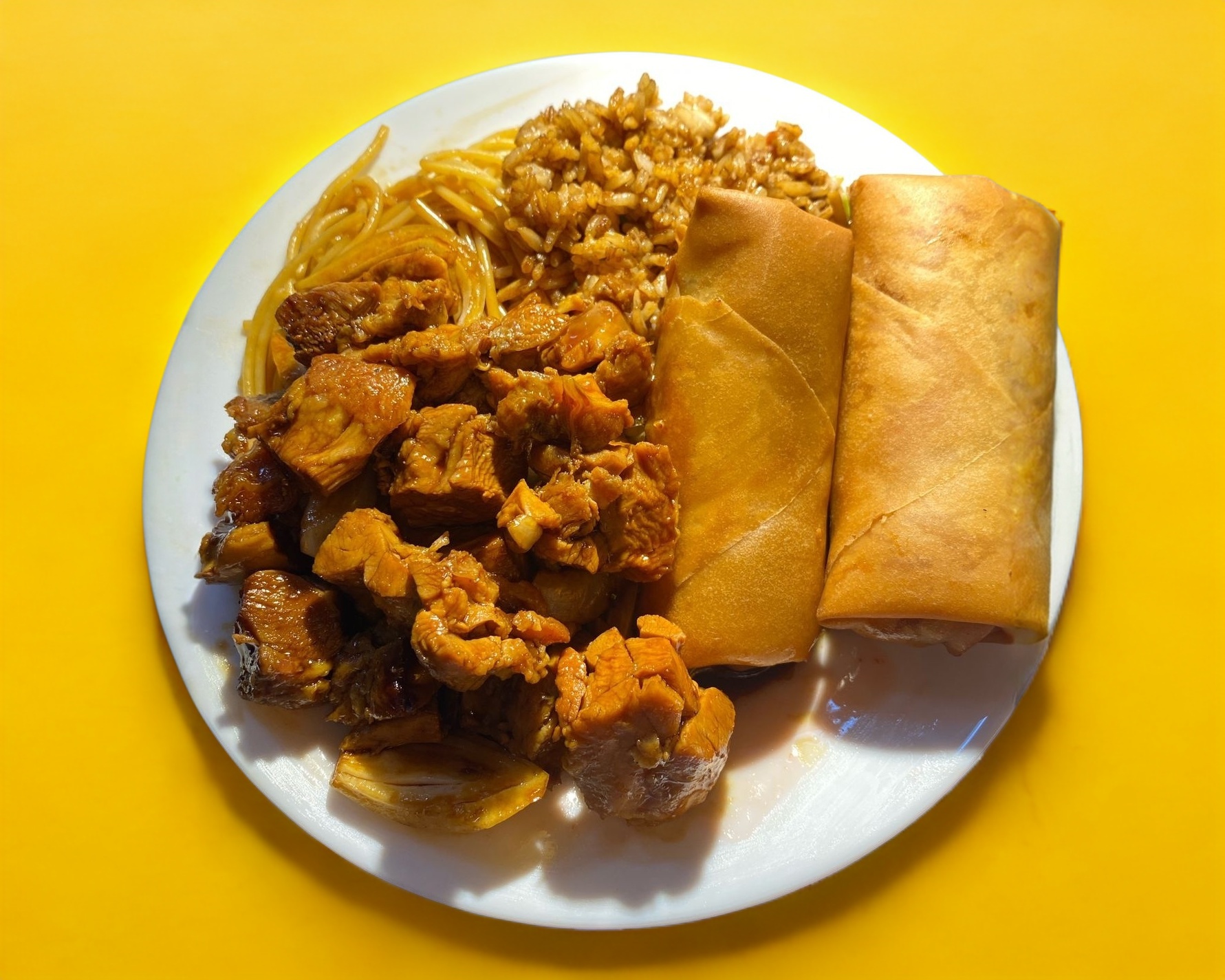 Pollo agridulce + 2 rollos + arroz y pasta
