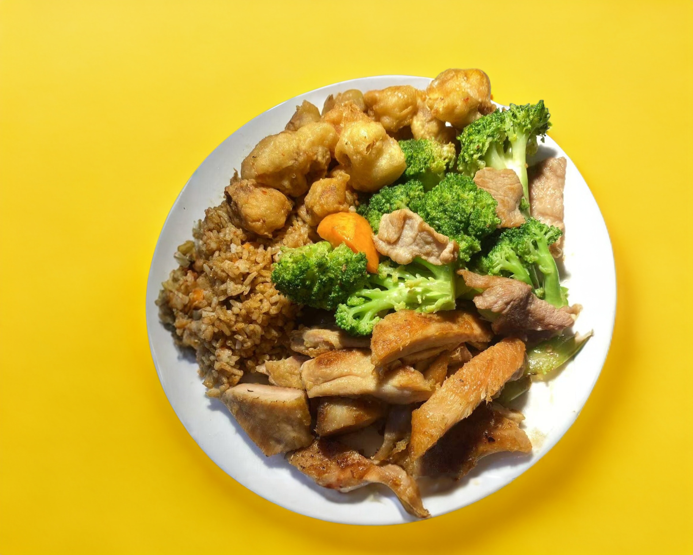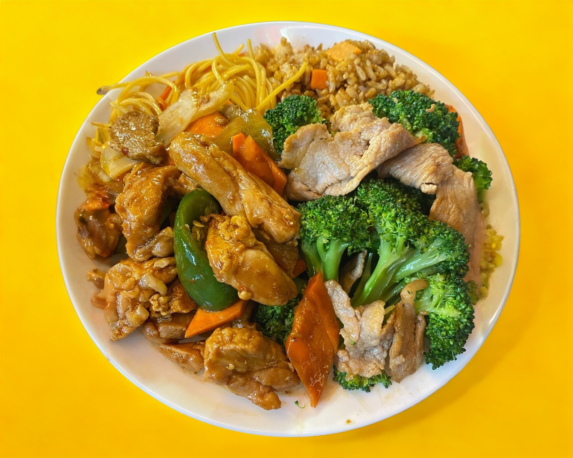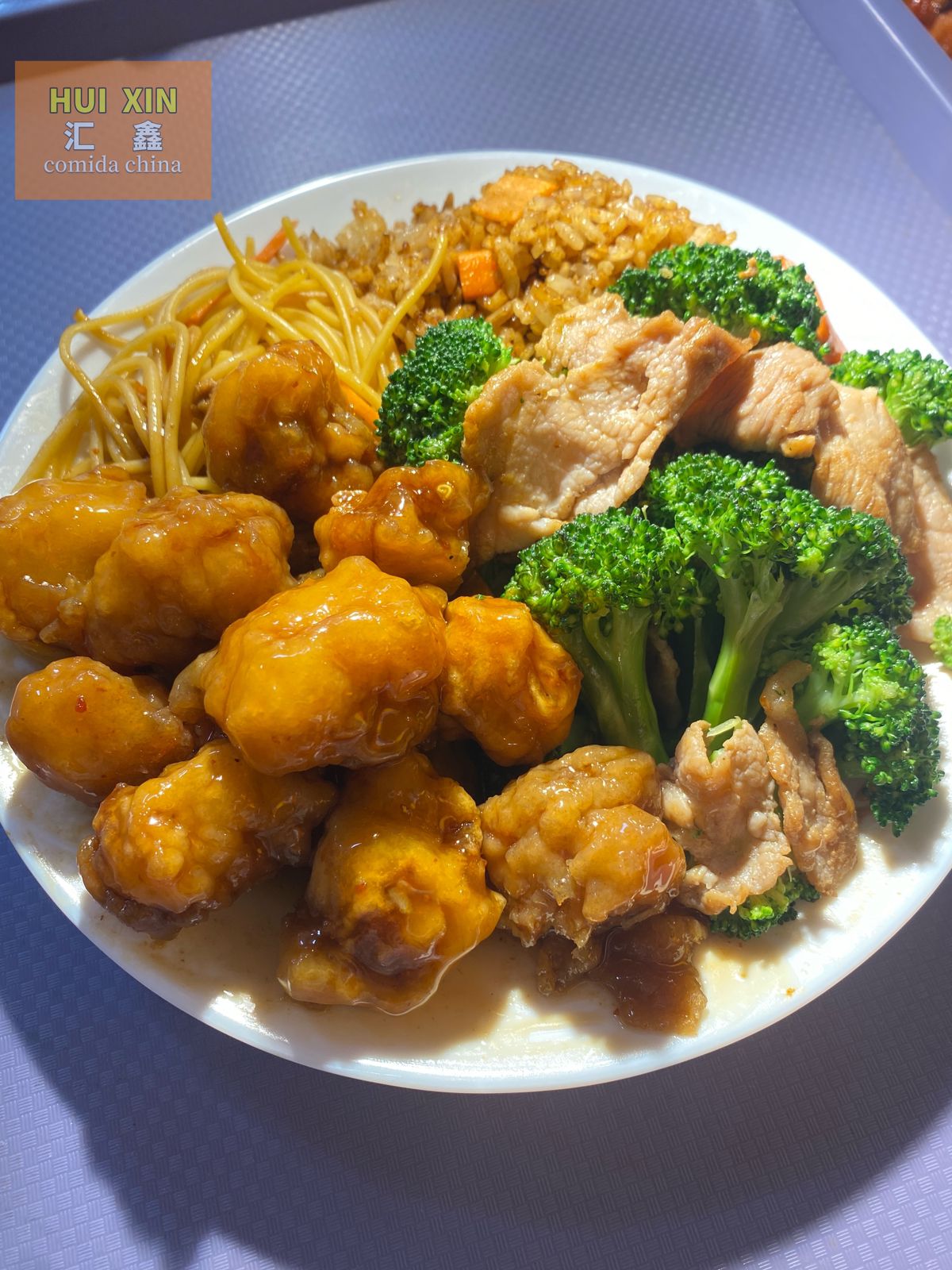Tres Guisos Con Arroz Mixto O Pasta Mixta. los guisos son: Pollo Agridulce, Pollo Empanizado, Pollo Picante, Brócoli Con Res, Pollo Agridulce Picoso, Carne De Res Picante, Pollo Cantonés, Pollo Con Vegetales, 2 Rollos, Pollo A La Plancha O Pollo BBQ