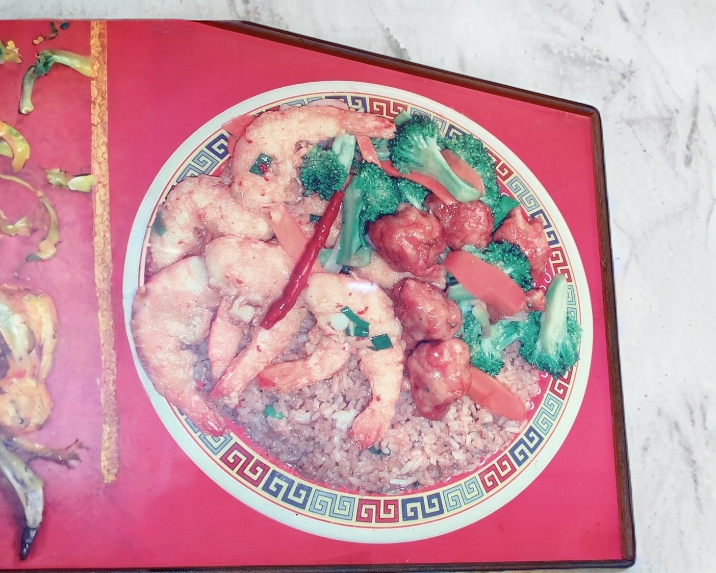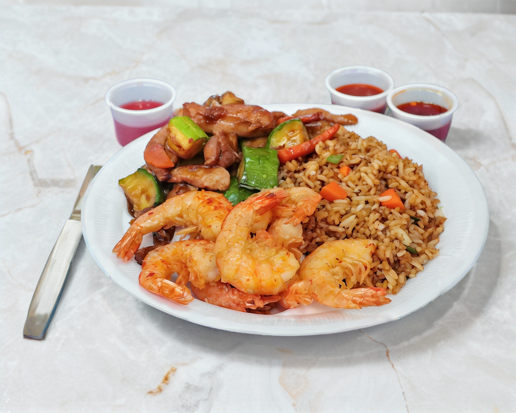 Tres guisos con camarón acompañado con arroz mixto o pasta mixta. Elige tres guisos, pollo agridulce, pollo empanizado, pollo picante, brócoli con res, pollo agridulce picoso, carne de res picante, pollo cantonés, pollo con vegetales, 2 rollos, pollo a la plancha o pollo bbq.