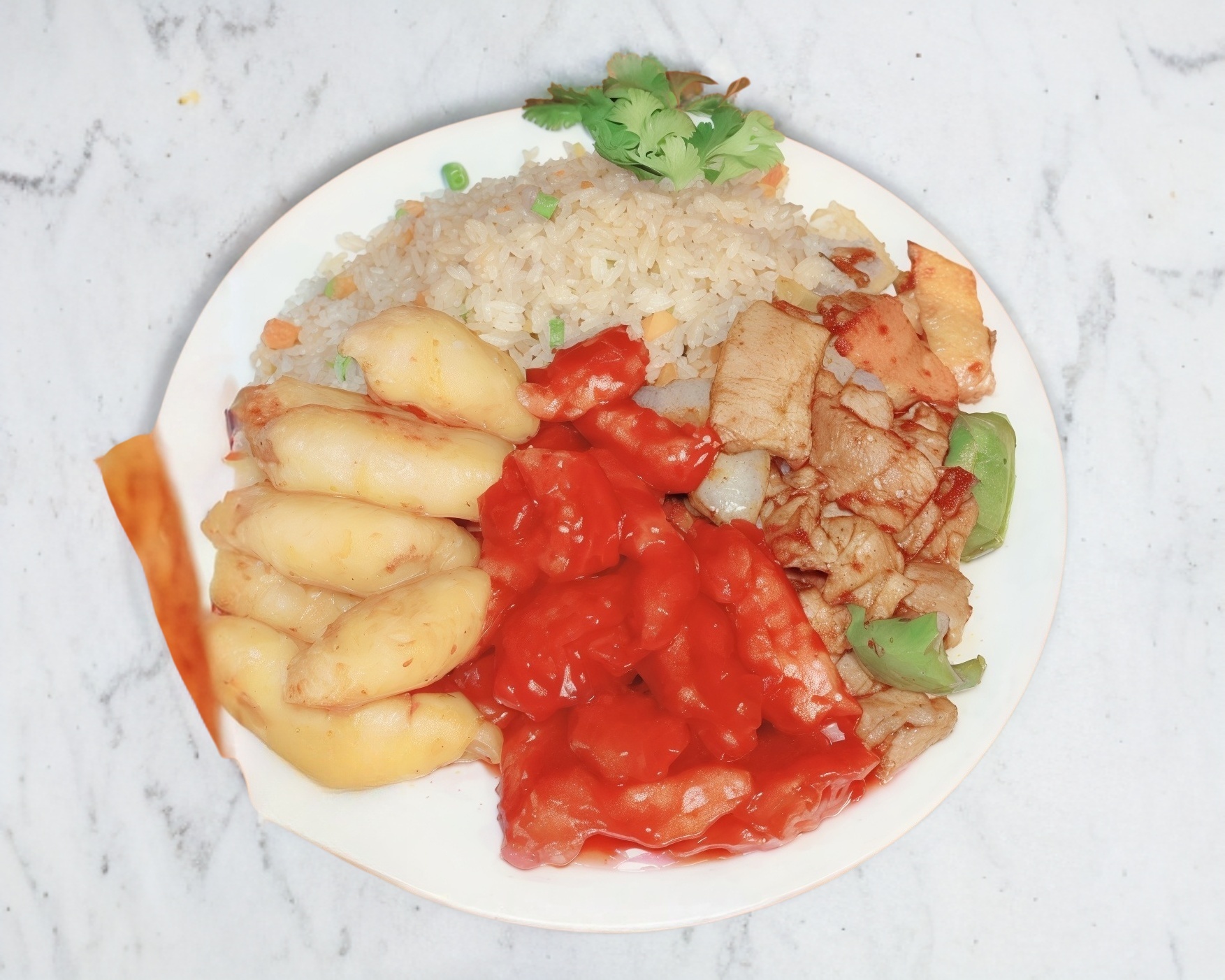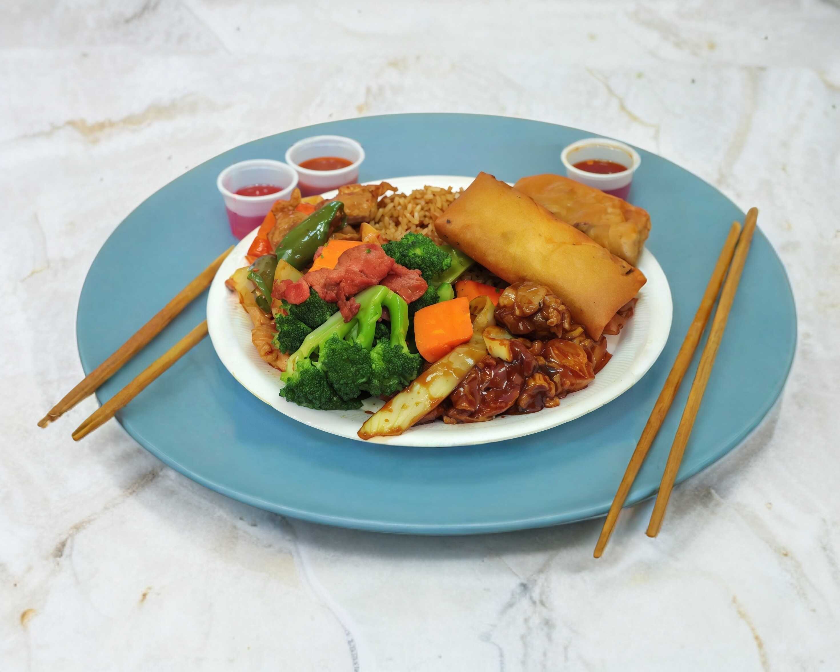 Tres guisos con arroz mixto o pasta mixta. Los guisos son: pollo agridulce, pollo empanizado, pollo picante, brócoli con res, pollo agridulce picoso, carne de res picante, pollo cantonés, pollo con vegetales, 2 rollos, pollo a la plancha o pollo bbq.